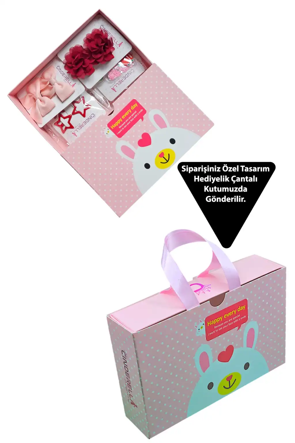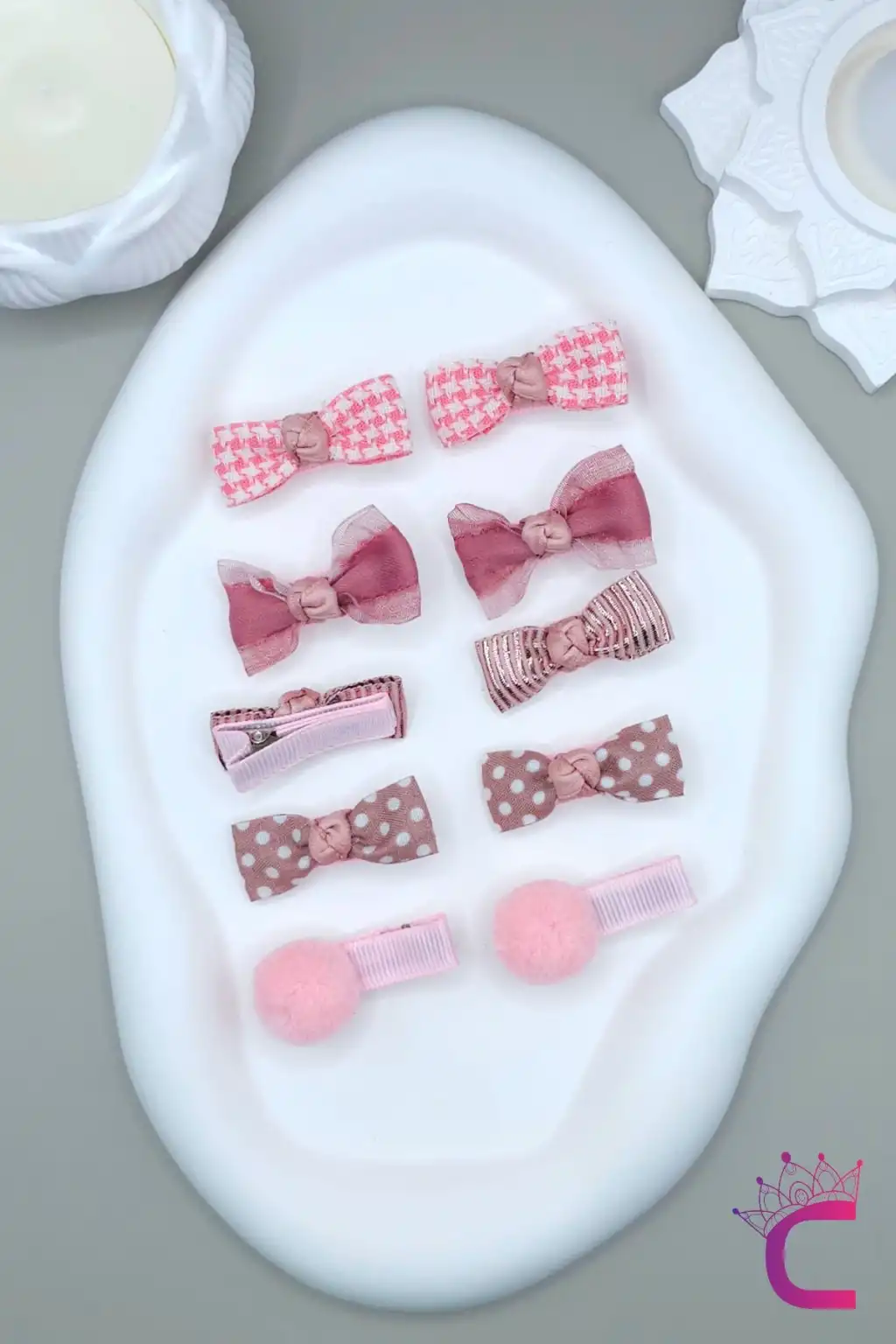 10lu Çanta Kutulu Hediyelik Kız Bebek Kurdele Fiyonk Toka Seti Pembe - Çocuk Astarlı Pens Saç Tokası