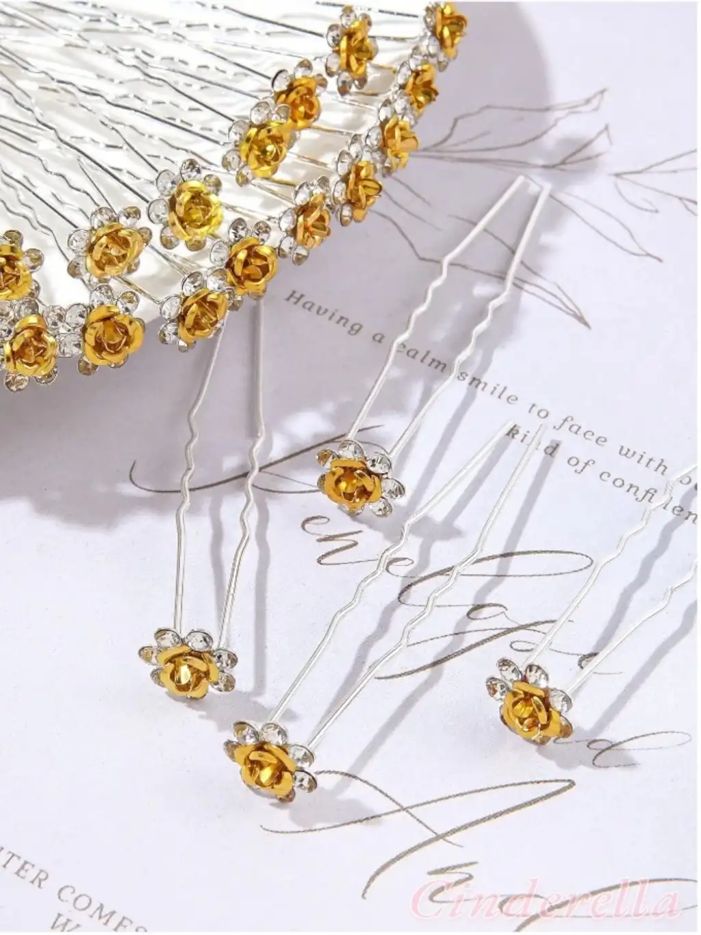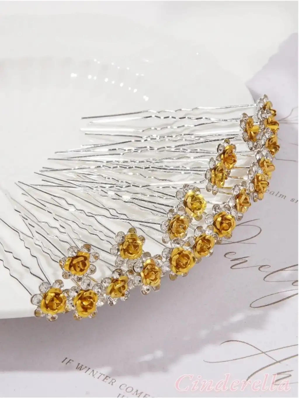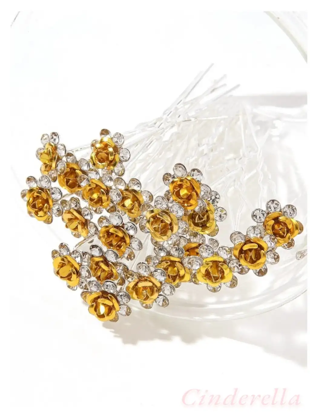 10'lu Mini Kristal Taşlı Çiçek Tasarım Firkete Toka Gold - Düğün Gelin Saç Aksesuarı Topuz Tokası