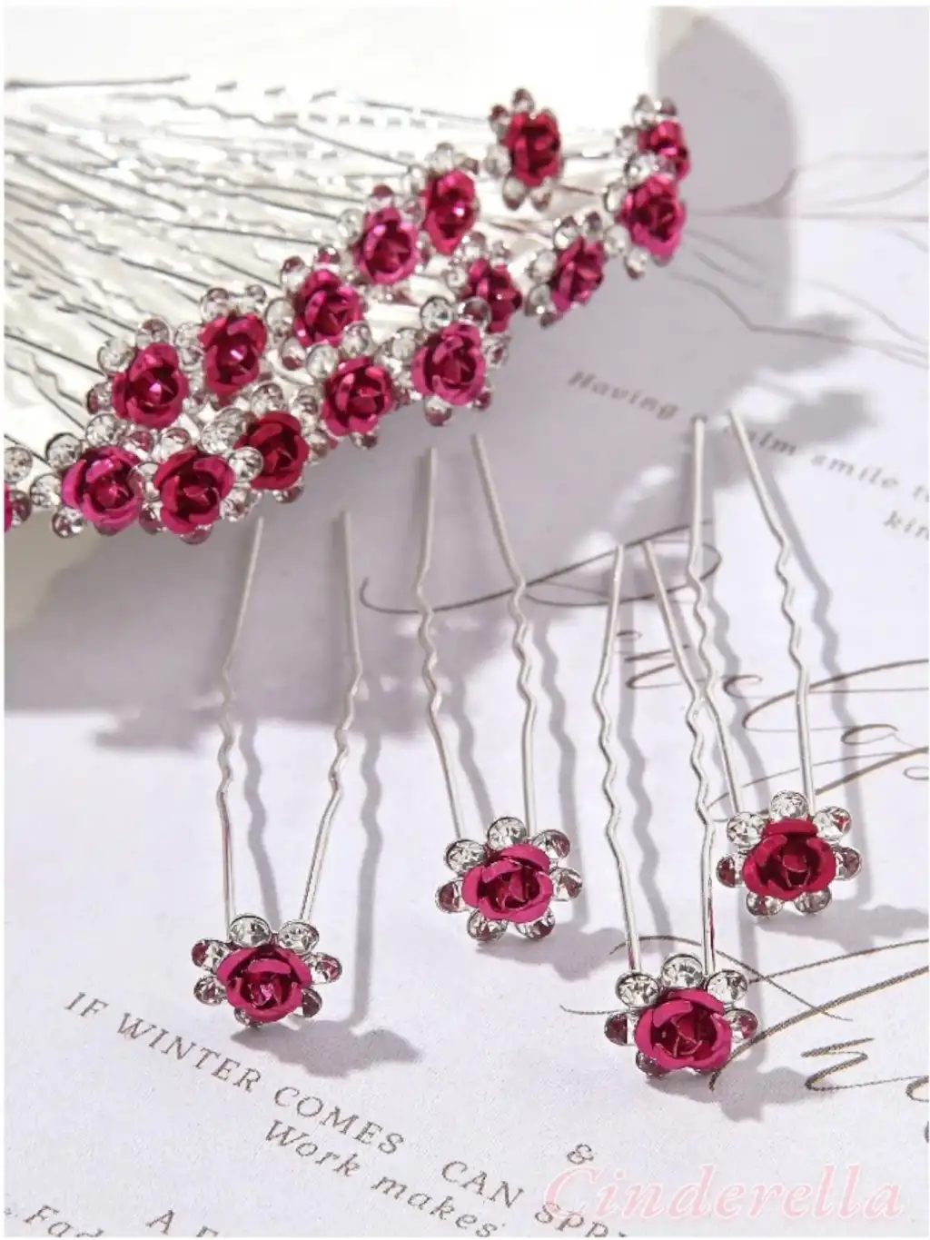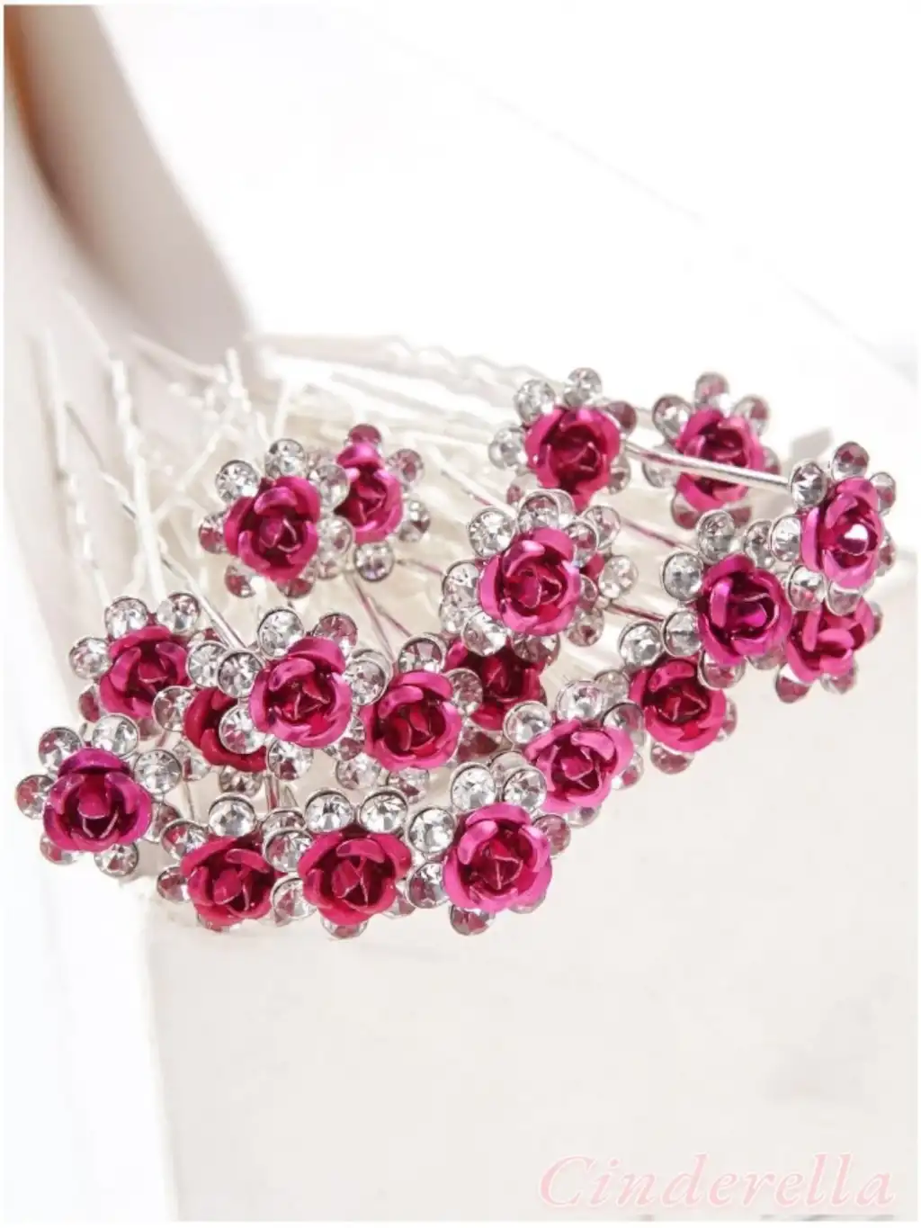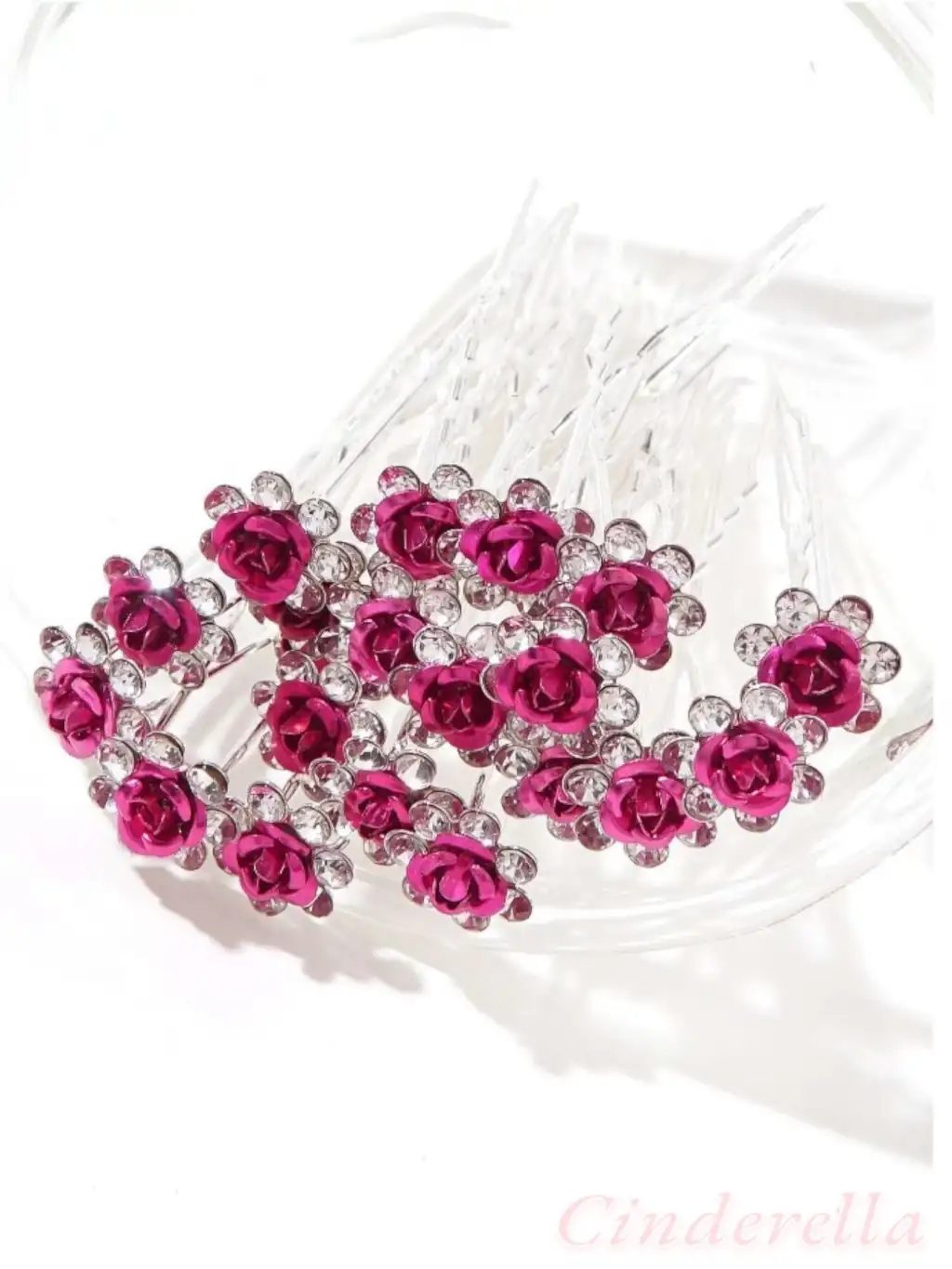 10'lu Mini Kristal Taşlı Çiçek Tasarım Firkete Toka Sıcak Pembe - Nikah Kına Söz Topuz Saç Tokası