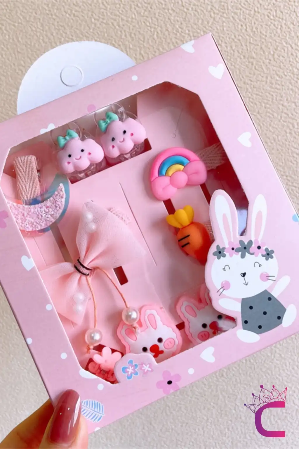 10'lu Özel Tasarım Hediyelik Kutulu Kız Bebek Toka Seti - Gökkuşağı Tavşan Kurdele Fiyonk Saç Tokası