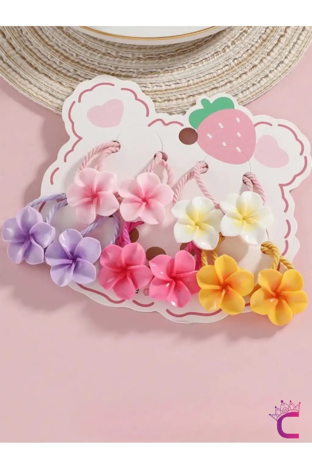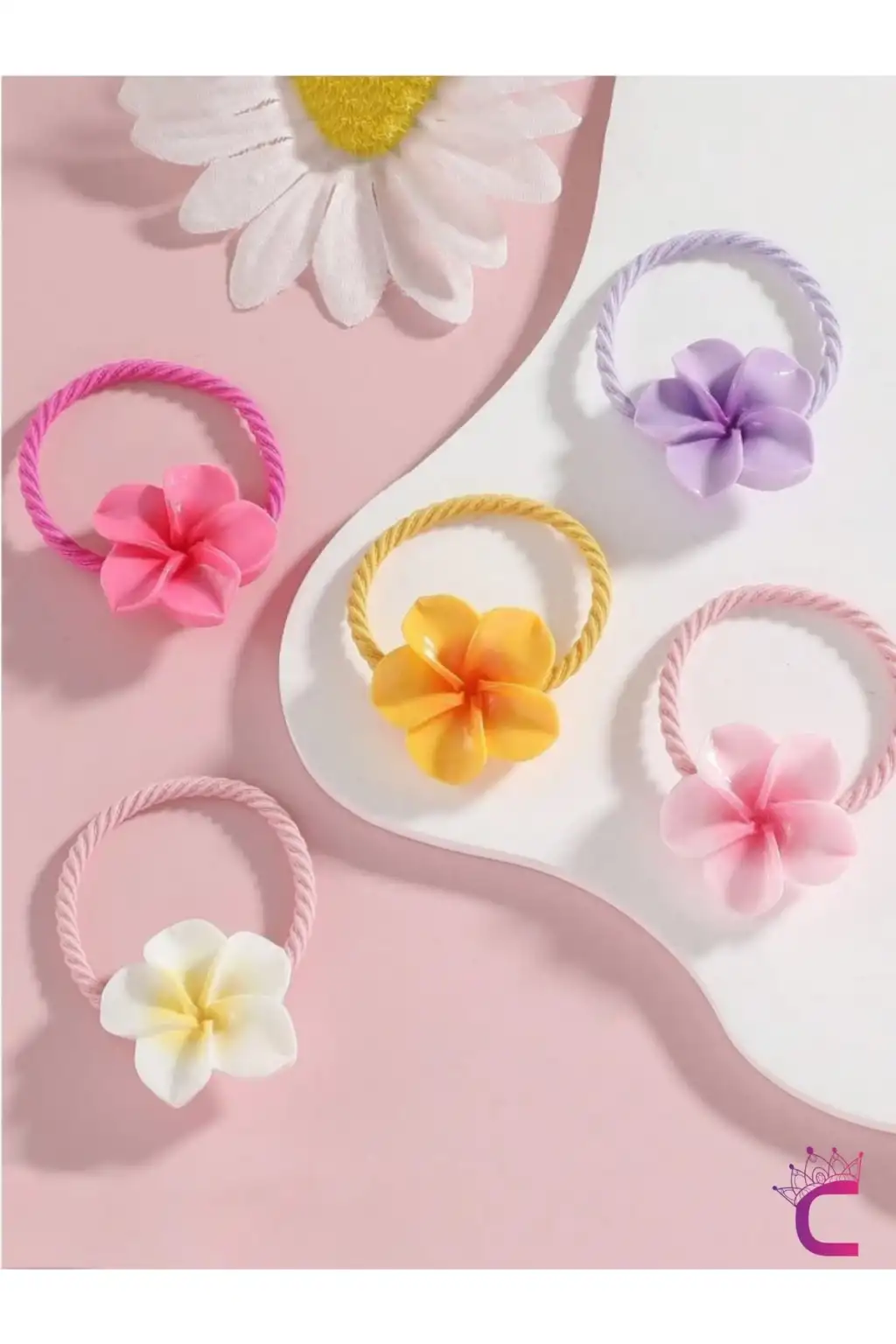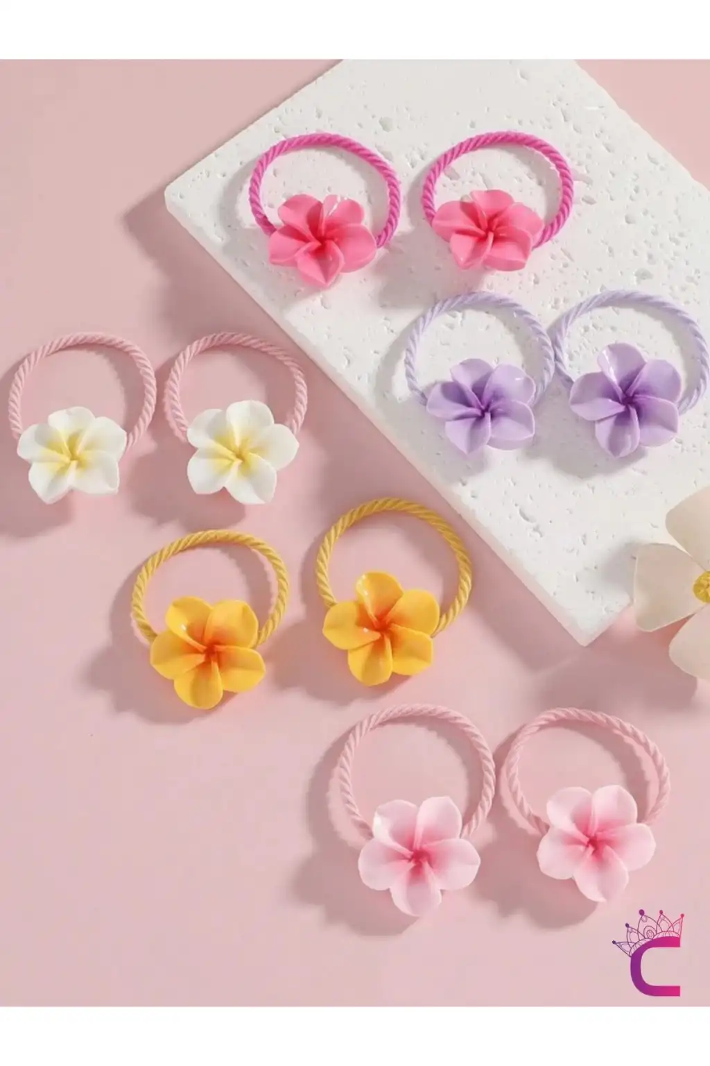 - Renkli ve canlı desenleriyle çocukların saçlarına neşe katan plumeria çiçekli lastik toka seti.