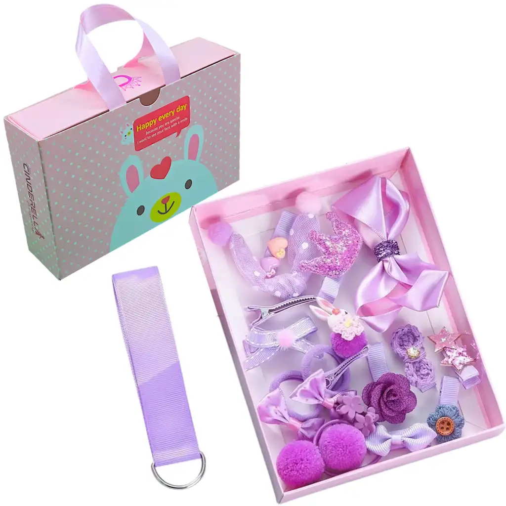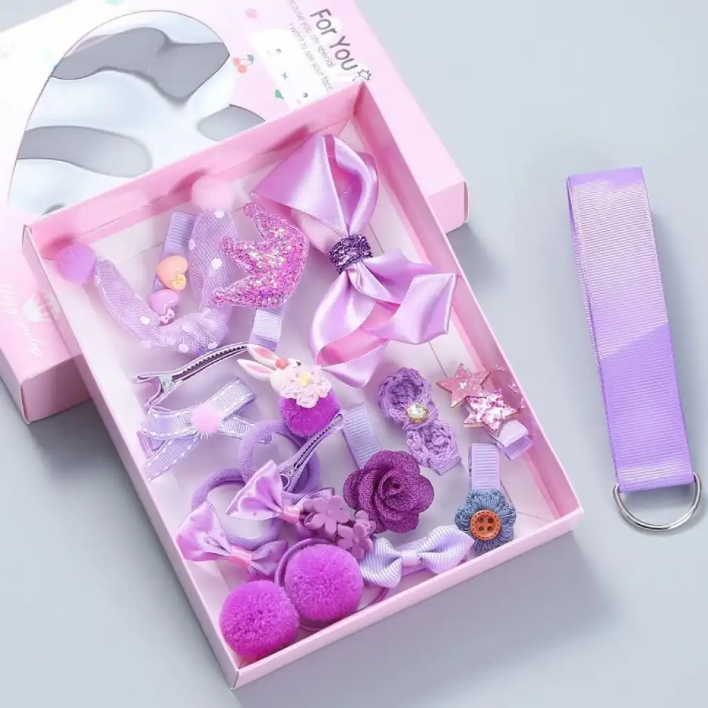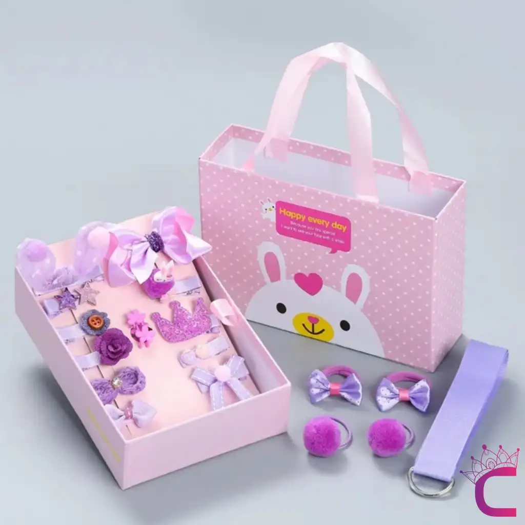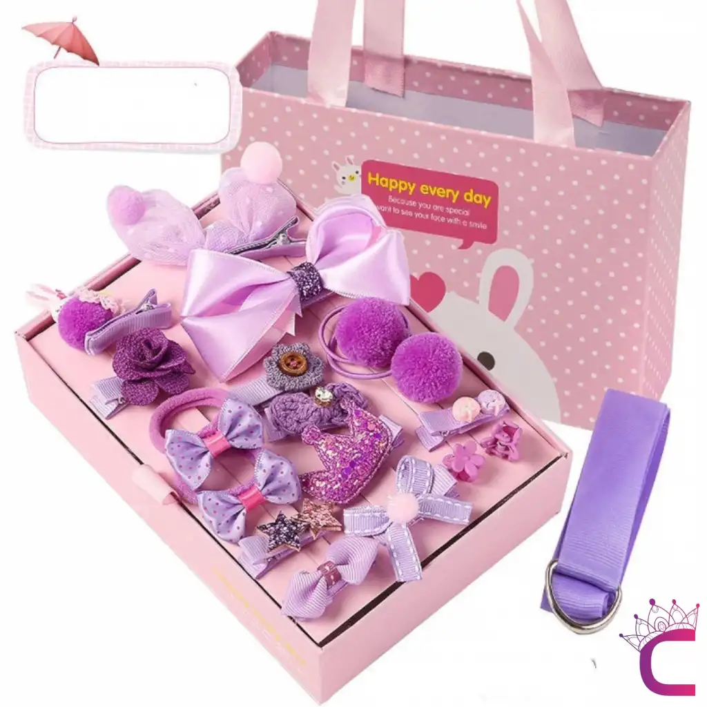 18'li Lila Hediyelik Çanta Kutulu Kız Bebek Toka Seti - Çocuk Yıldız Fiyonk Lastik Pens Saç Tokası