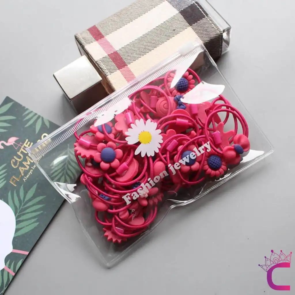 20'li Esnek Kız Çocuk Lastik Toka Seti Bordo Çiçek Kurdele Fiyonk Figür Lastikli Saç Tokası