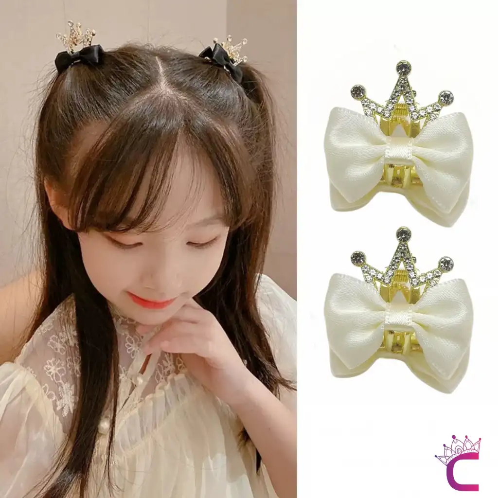 2'li Fiyonk Kurdele Kraliçe Taçlı Kristal Taşlı Saç Tokası Beyaz - Kız Çocuk Doğum Günü Prenses Tacı
