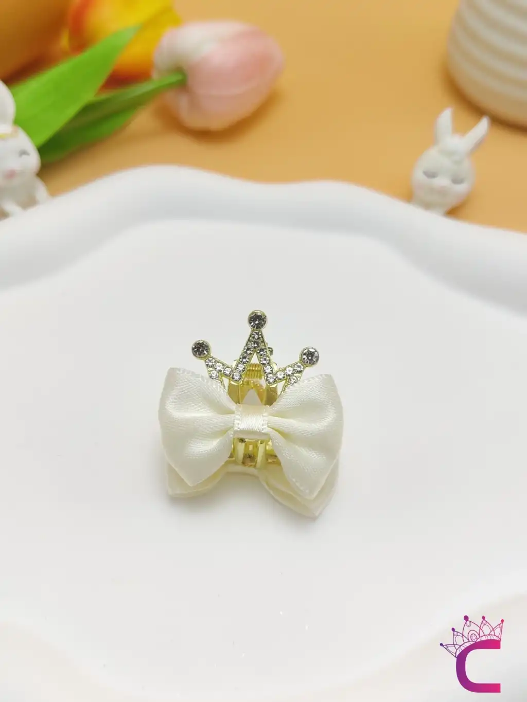 - İki adet fiyonk kurdele ve kristal taş detaylarıyla süslenmiş olan bu tacın her bir parçası özenle işlenmiştir.