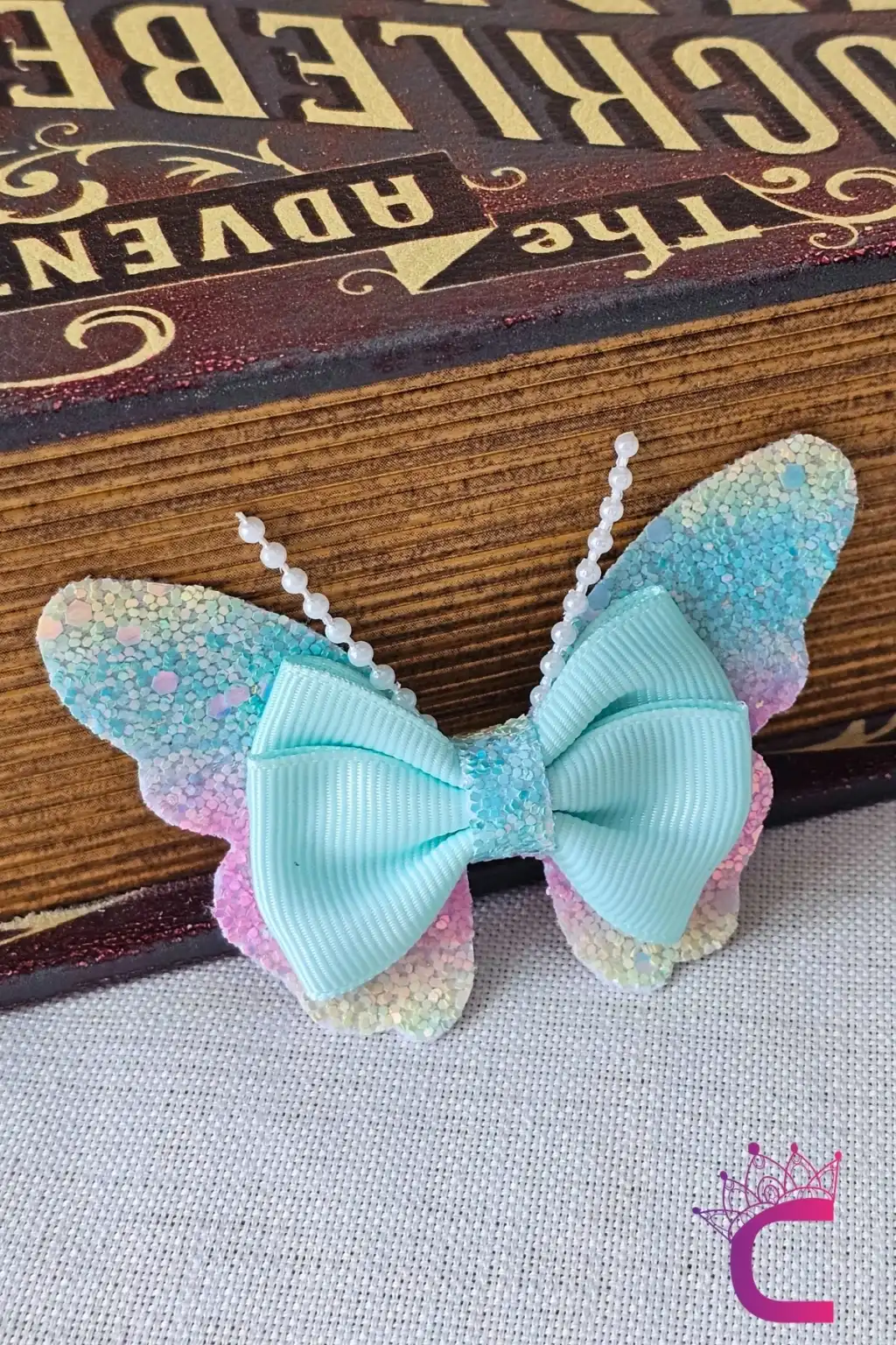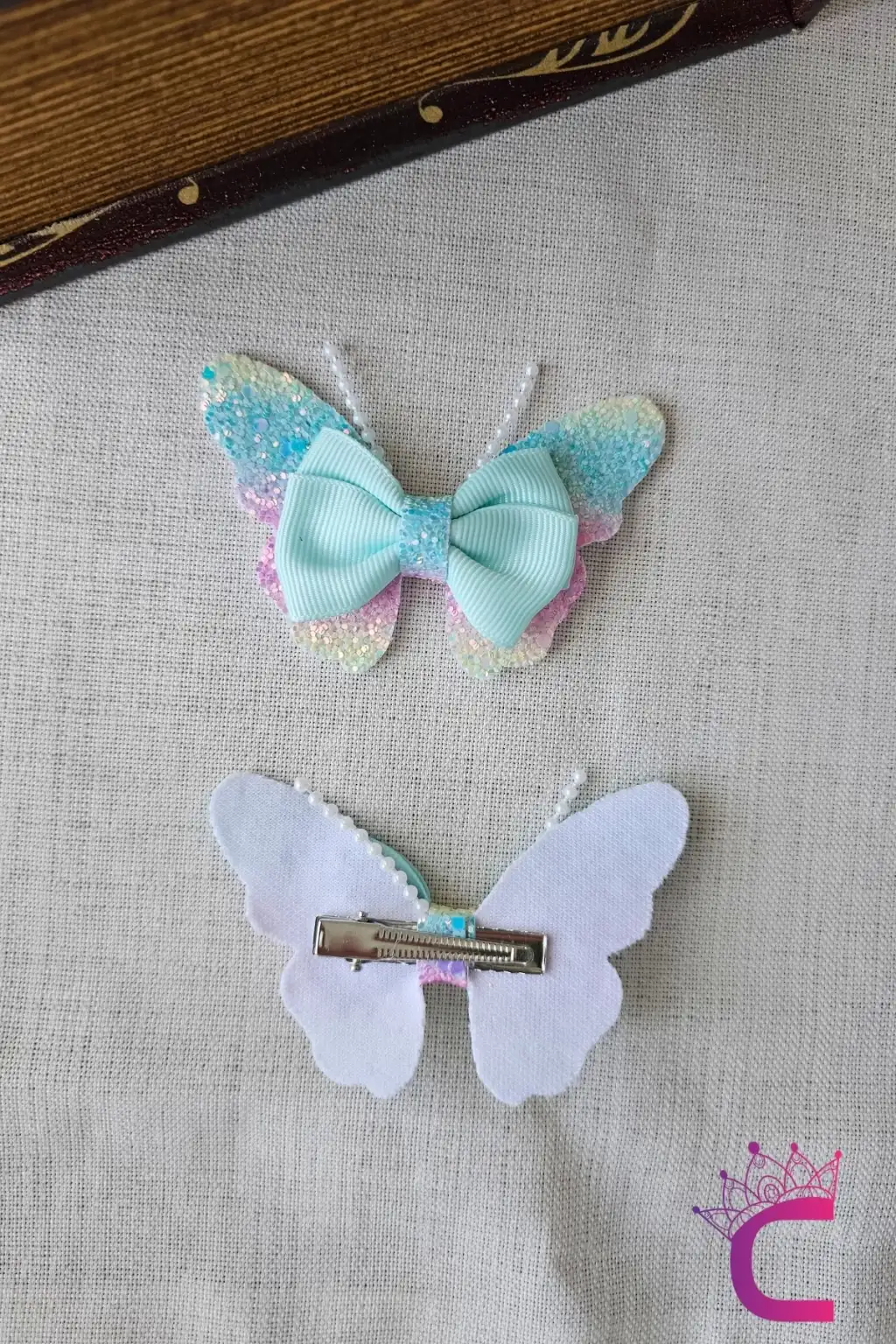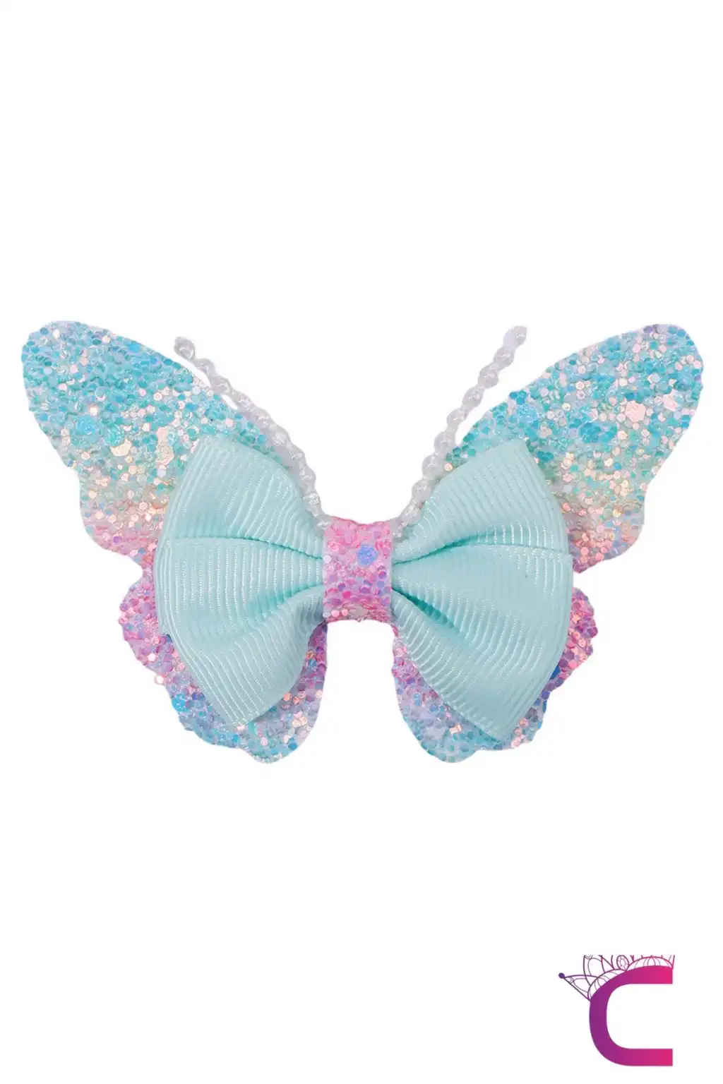 2'li Gökkuşağı Renkli Simli İncili Kız Çocuk Fiyonklu Kurdeleli Mavi Kelebekli Pens Toka Seti 8cm