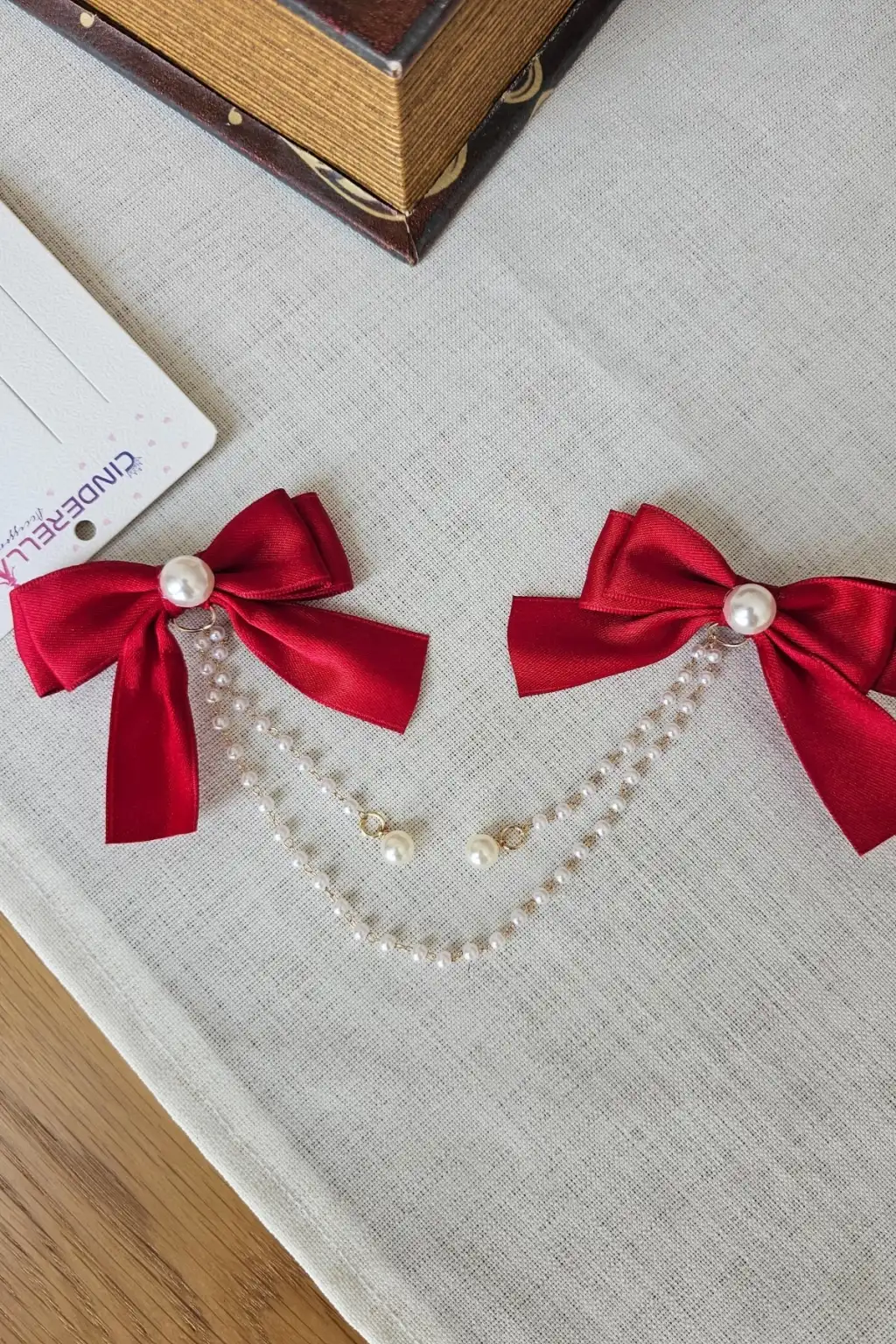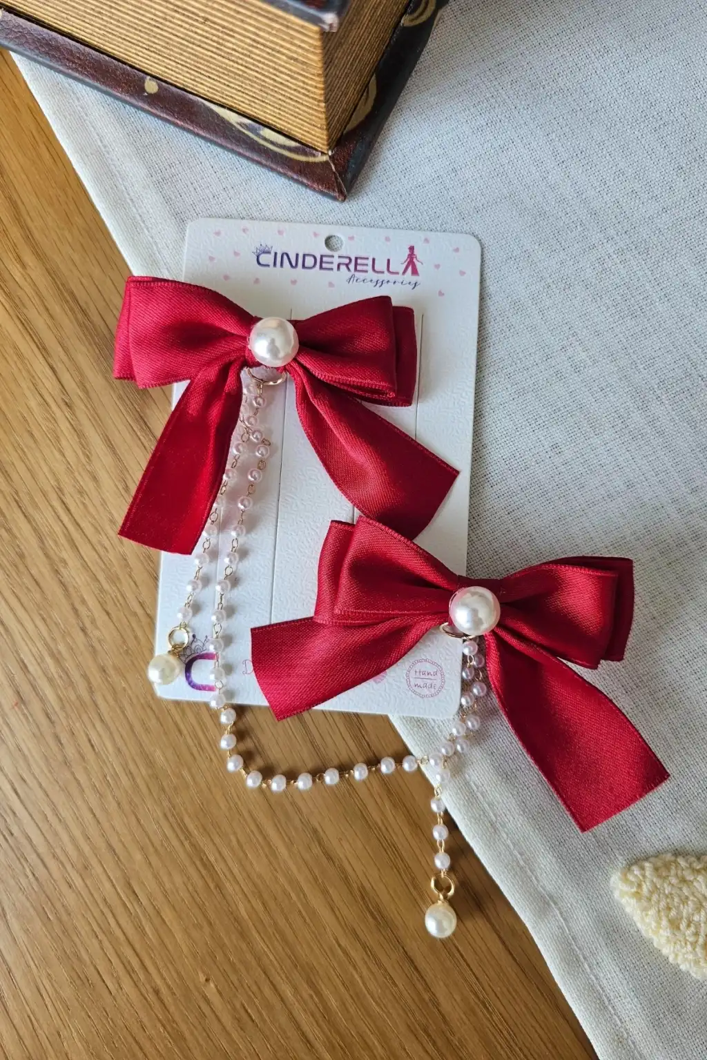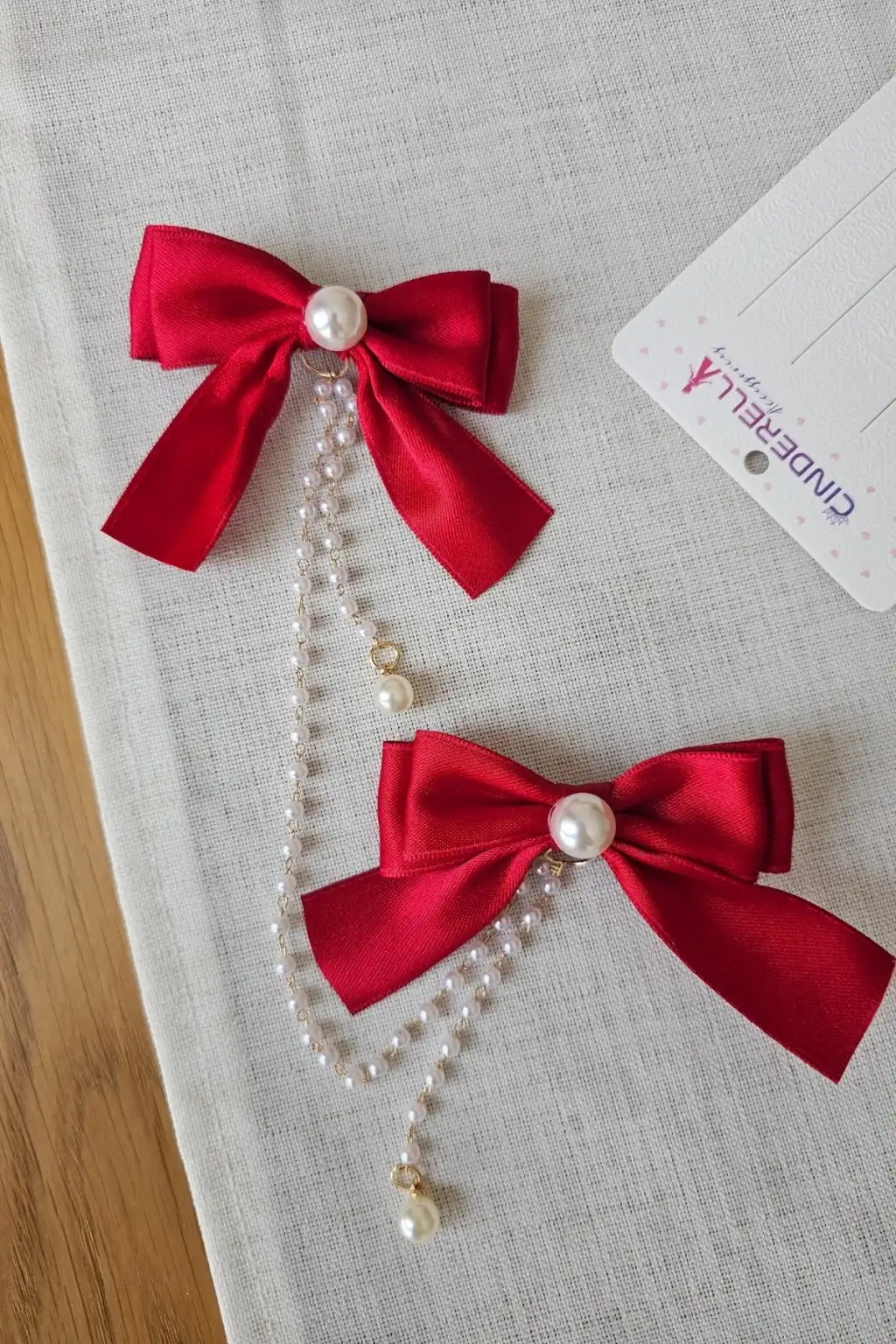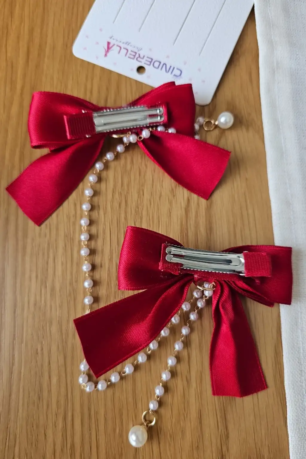 2'li İncili Sallantılı Kırmızı Fiyonk Pens Toka Seti - Zarif Kız Çocuk Kurdeleli Fiyonklu Saç Tokası