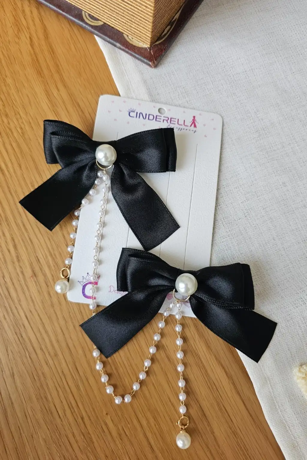 2'li İncili Sallantılı Siyah Fiyonk Pens Toka Seti - Zarif Kız Çocuk Kurdeleli Klipsli Saç Tokası
