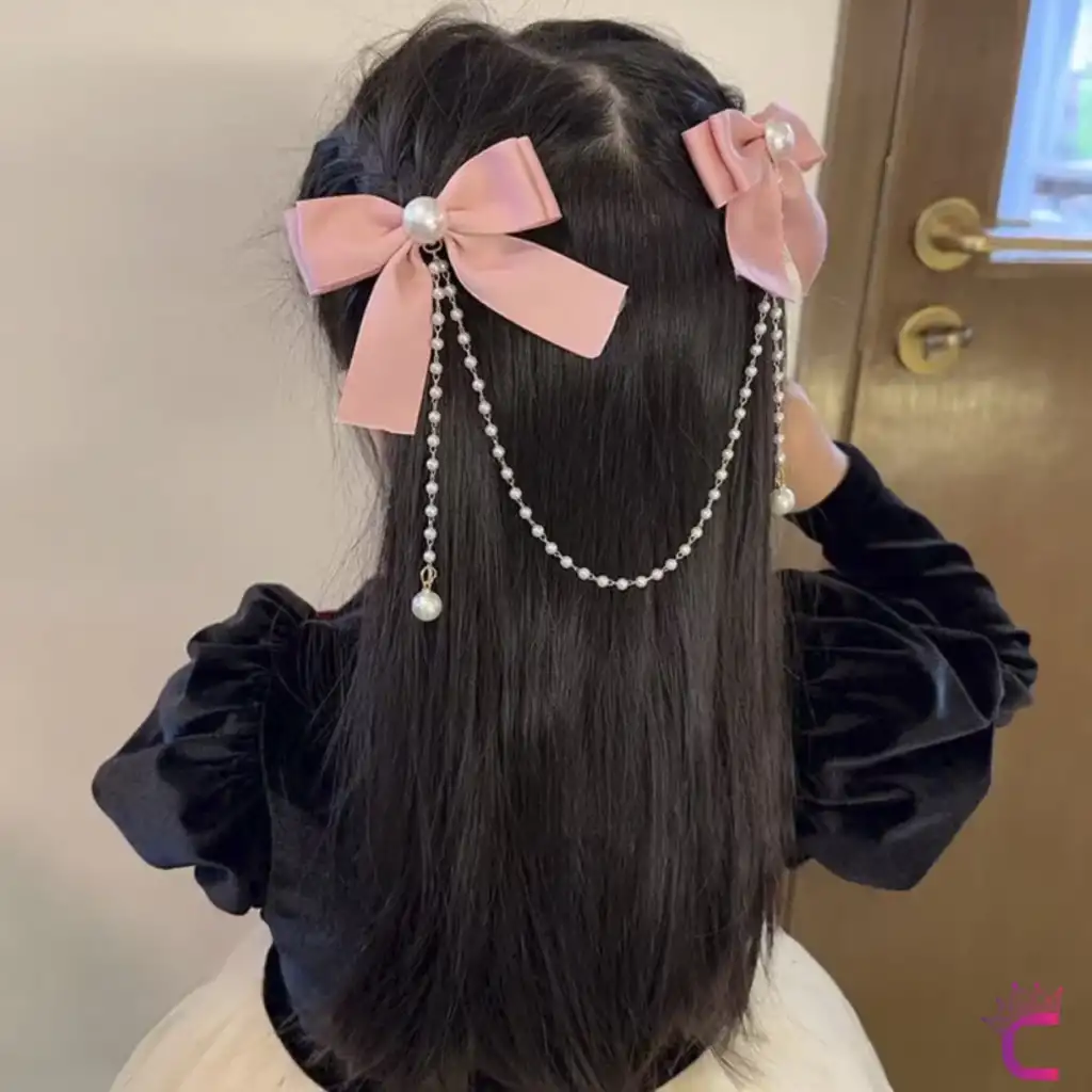 2'li İncili Sallantılı Pembe Fiyonk Pens Toka Seti - Zarif Kız Çocuk Kurdeleli Klipsli Saç Tokası