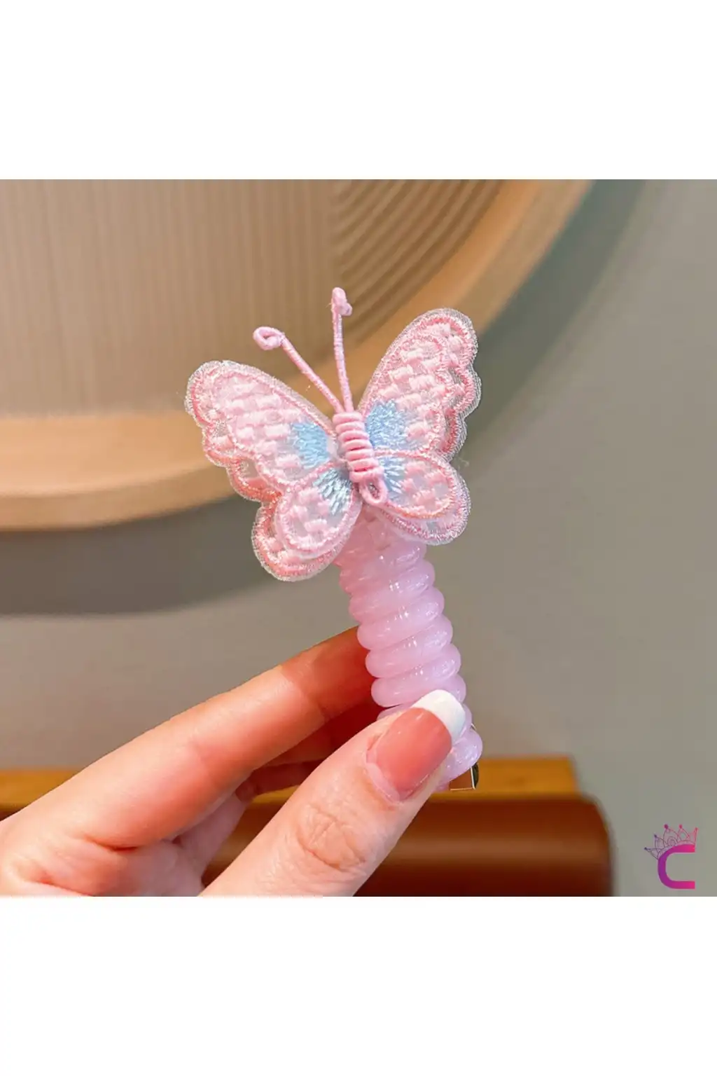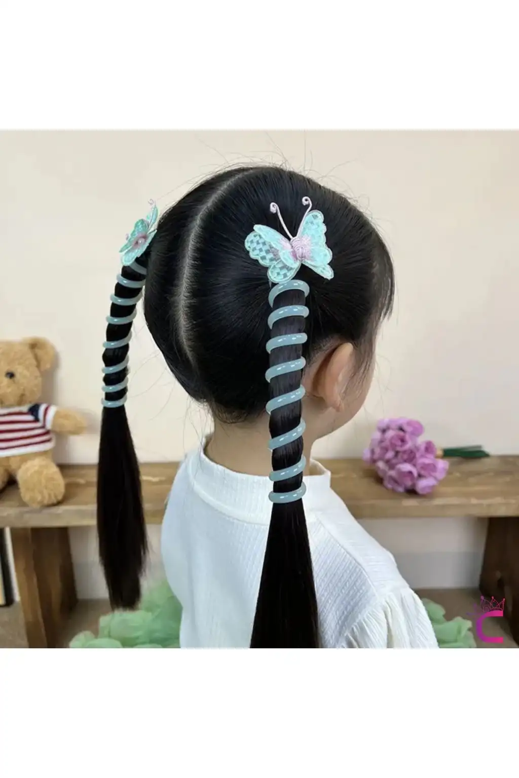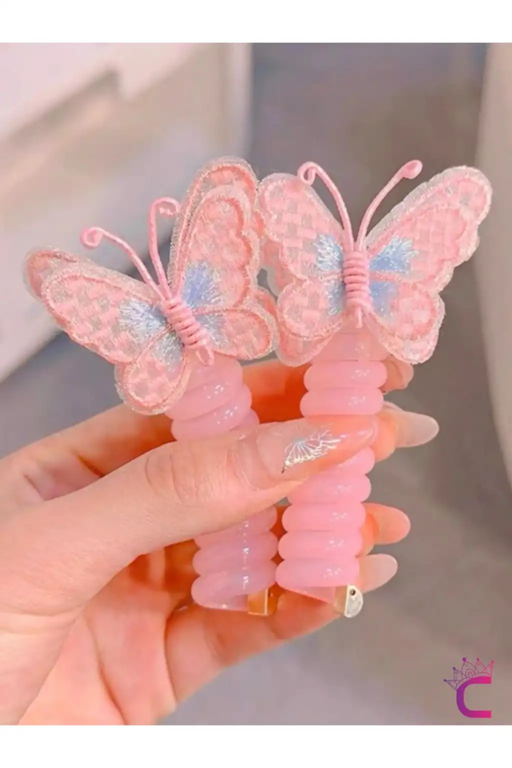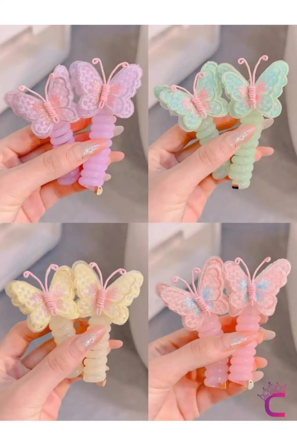 - Çocukların saçlarını şık ve eğlenceli bir şekilde toplamak için ideal, pembe ve mavi tül kelebek desenleriyle süslenmiş yaylı spiral makarna tokalar.