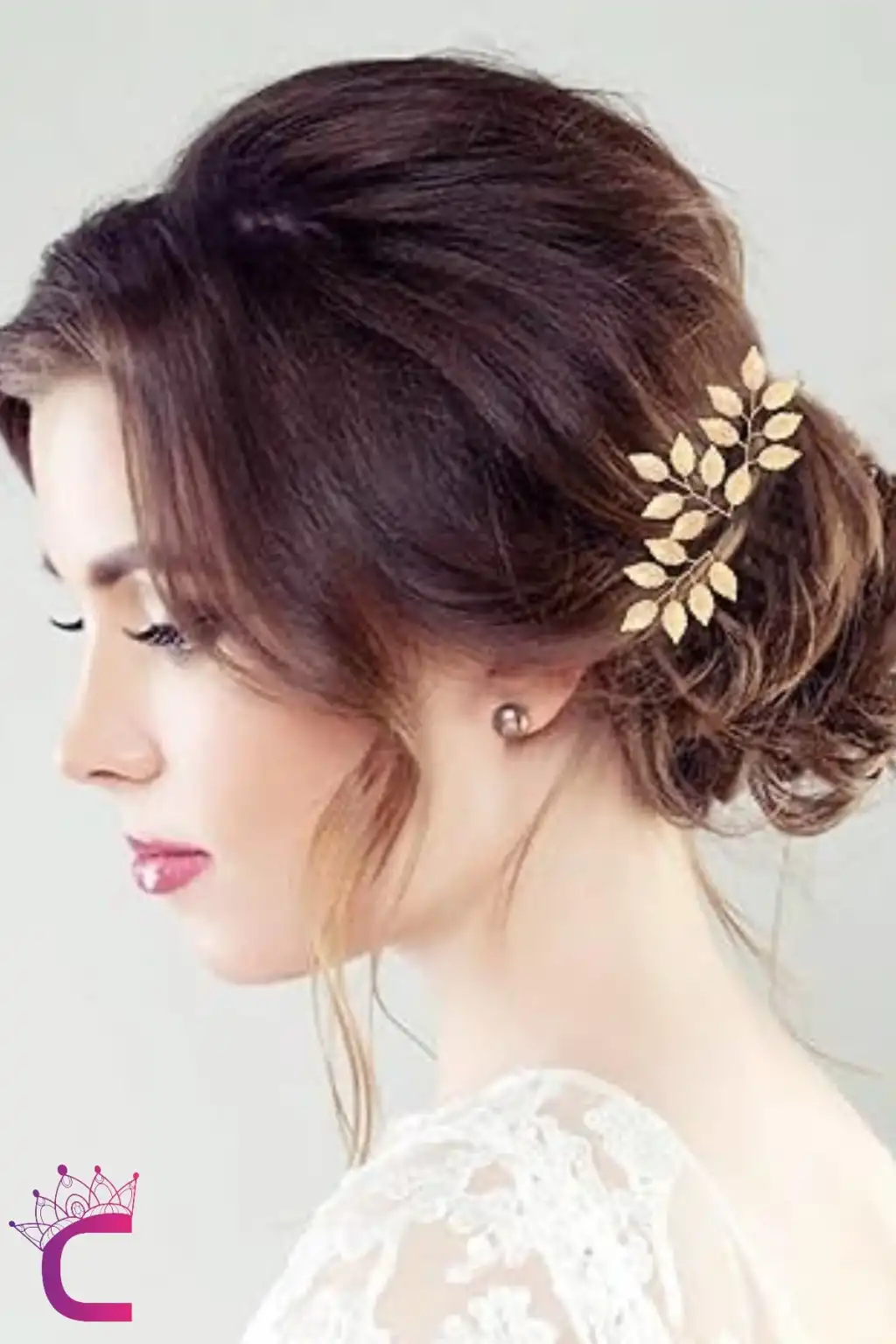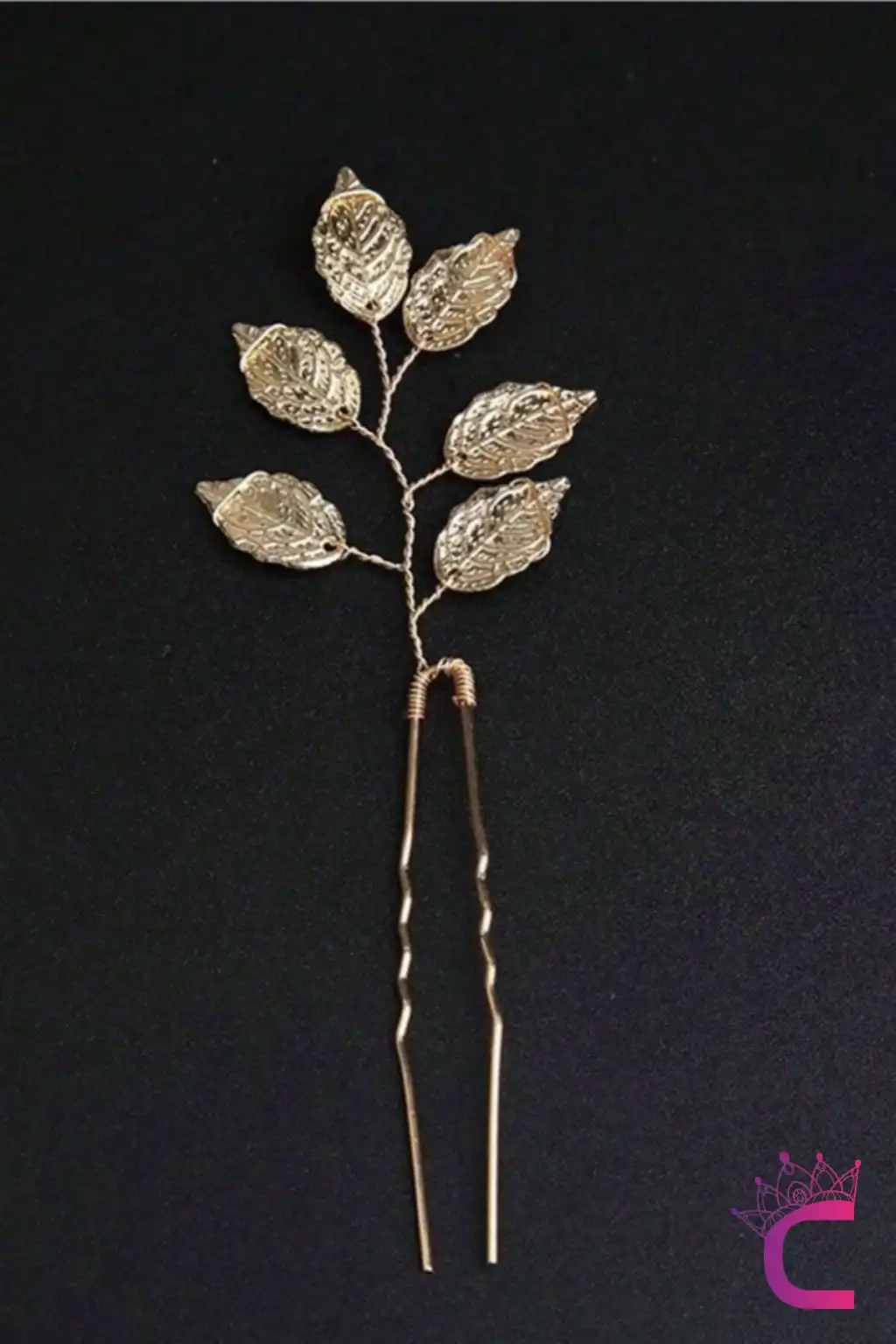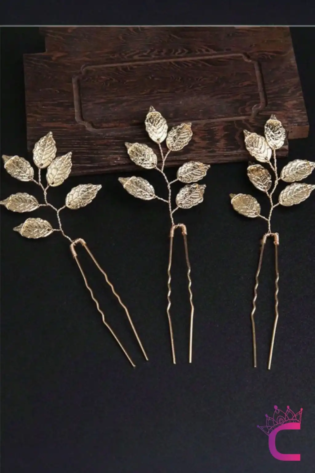 3'lü Gold Yaprak Gelin Tacı Firkete Seti - Düğün Nişan Nedime Nikah Söz Aksesuar Topuz Saç Tokası