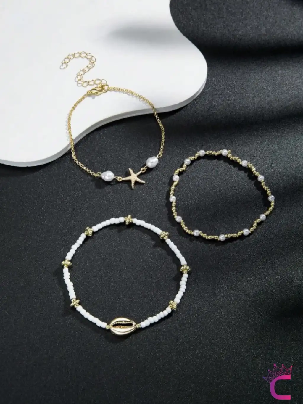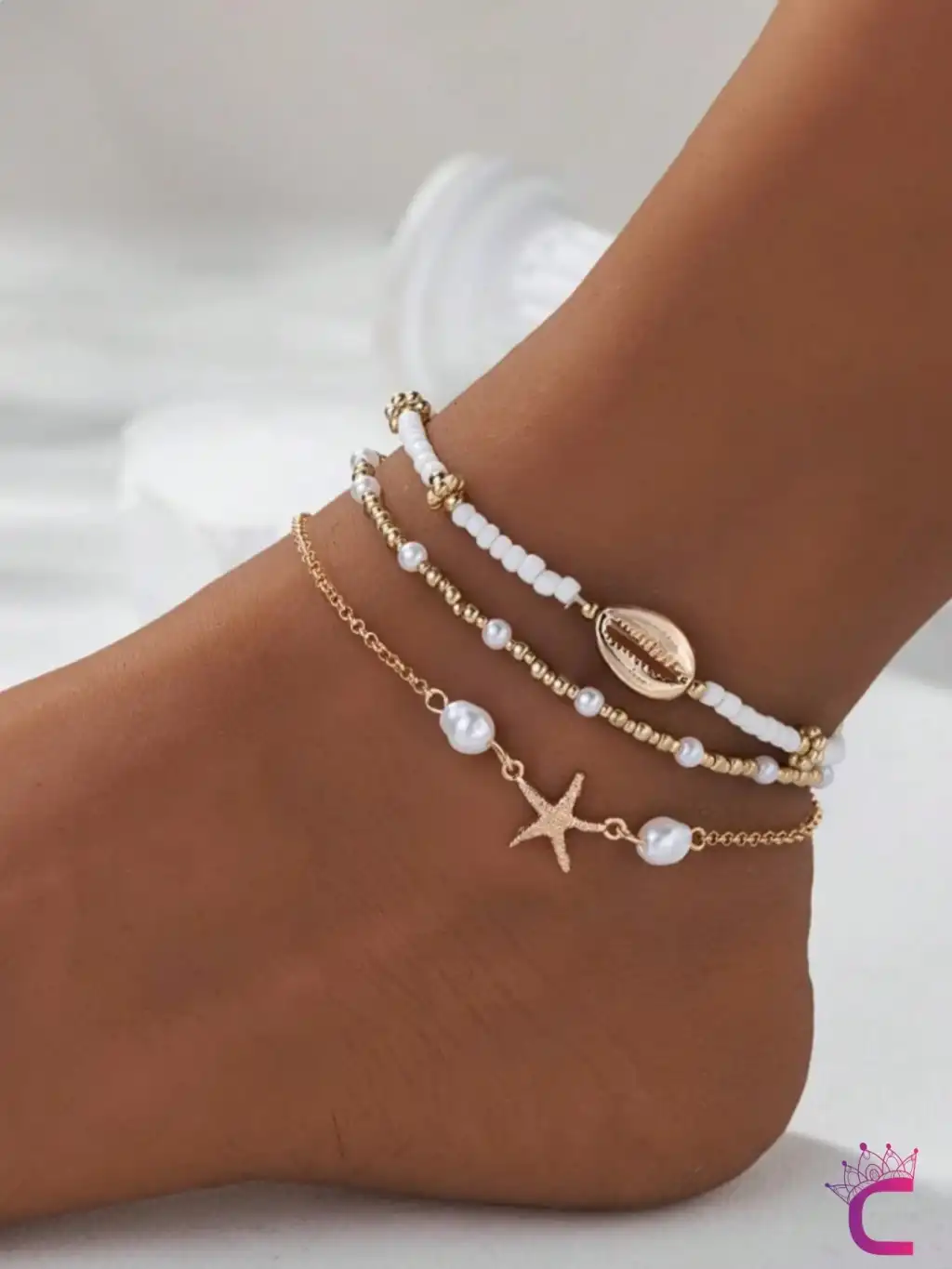 - Altın rengi detaylarıyla dikkat çeken bu halhal seti, plaj şıklığınızı tamamlar.