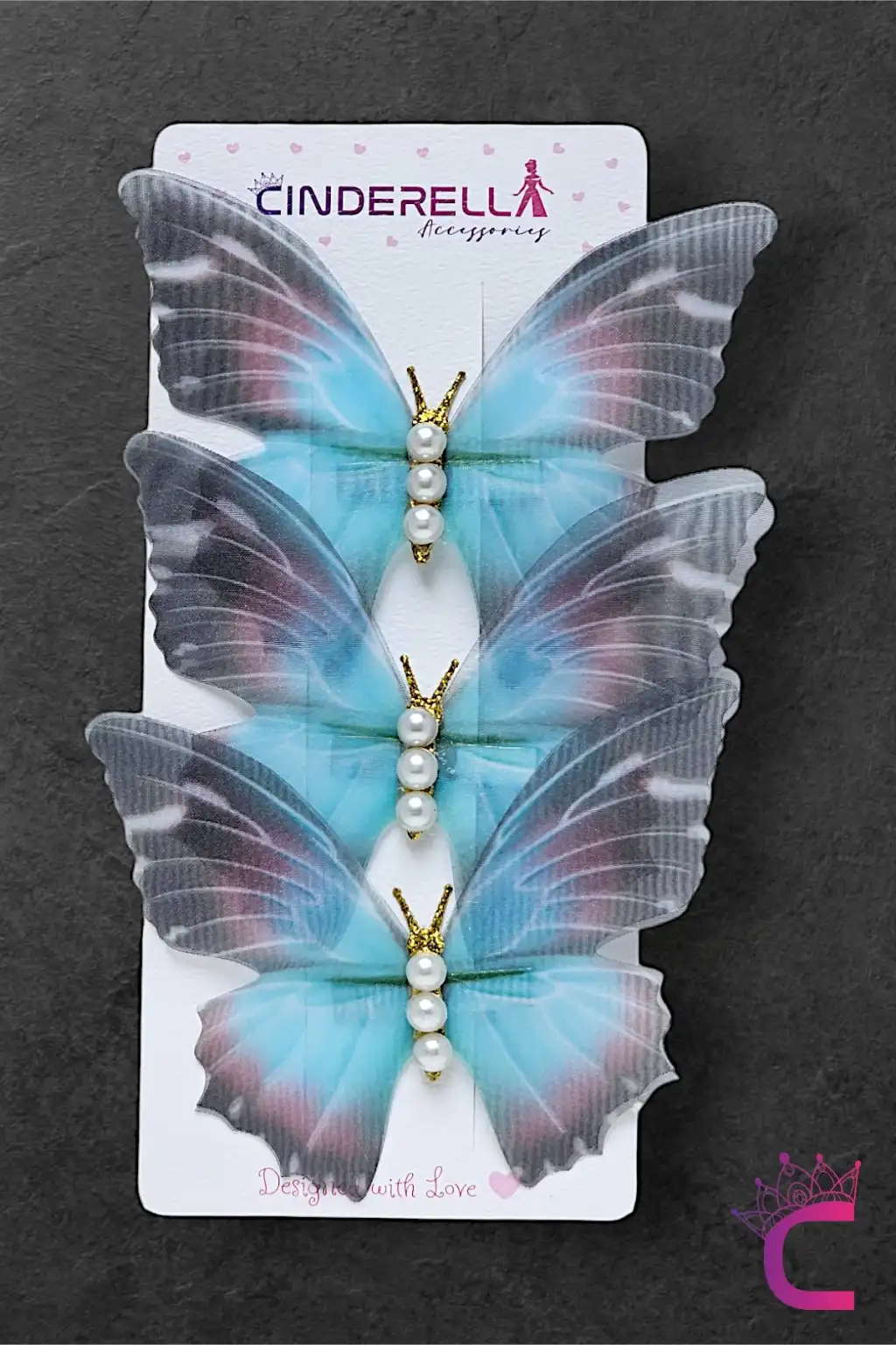 3'lü Mavi Degrade İnci Taşlı Tül Hareketli Kelebek Toka Seti 10cm - Büyük Boy Kelebekli Saç Tokası
