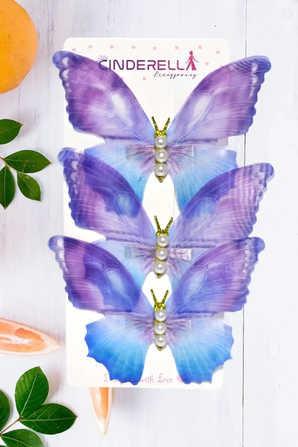 3'lü Mor Degrade İncili Taşlı Tül Hareketli Kelebek Toka Seti 10cm - Büyük Boy Kelebekli Saç Tokası