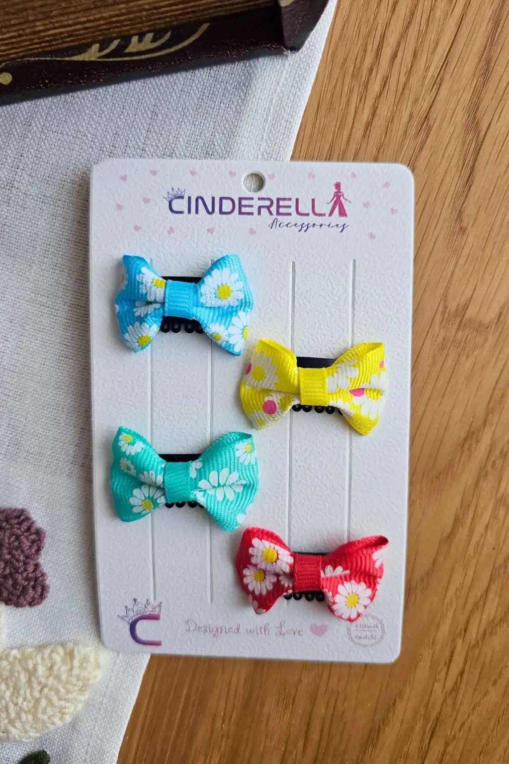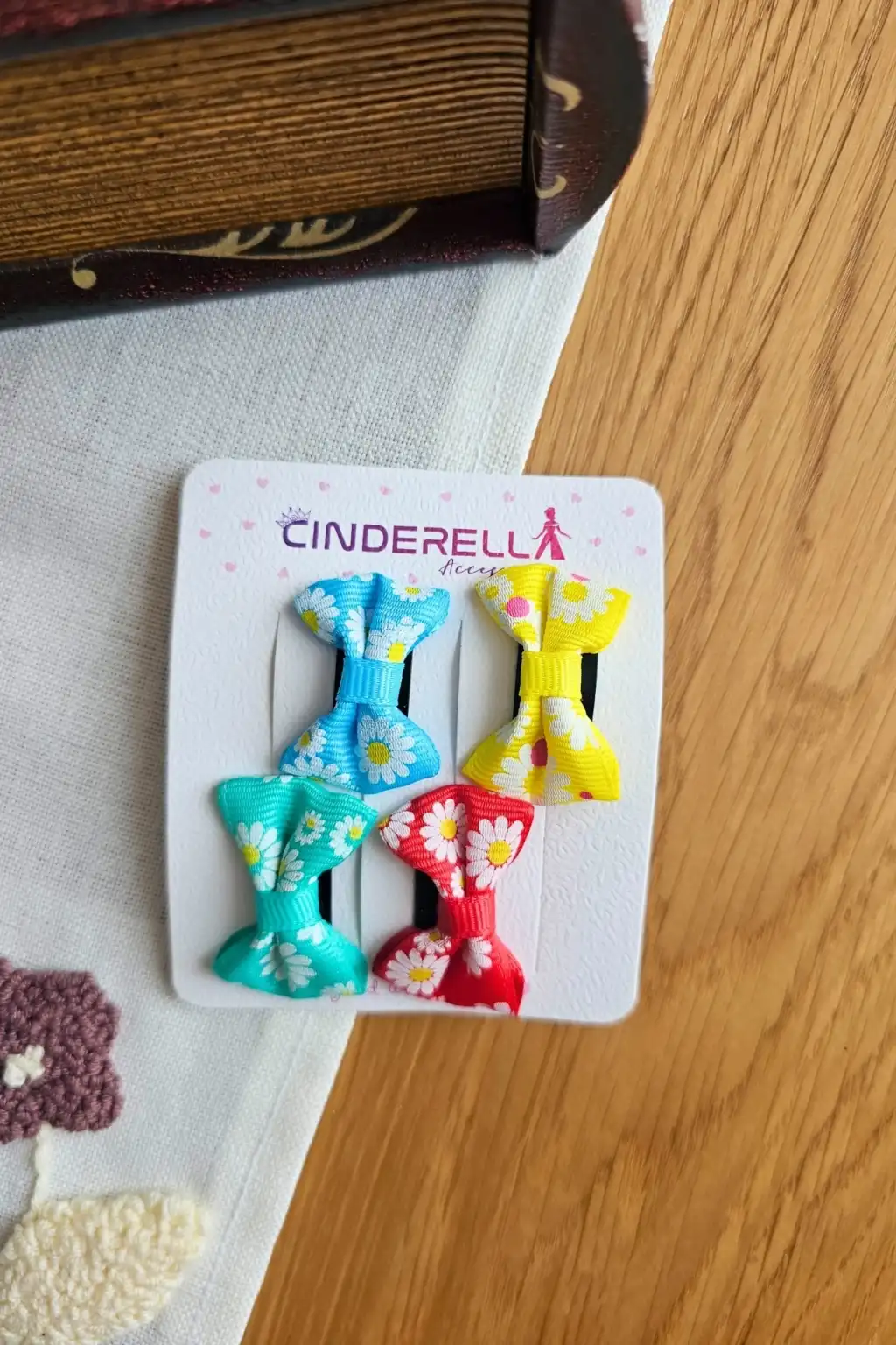 4'lü Çiçekli Fiyonk Saçsız Kız Bebek Tokası 4cm - Kurdeleli Az Saçlı Yenidoğan Saç Toka Seti Klipsi