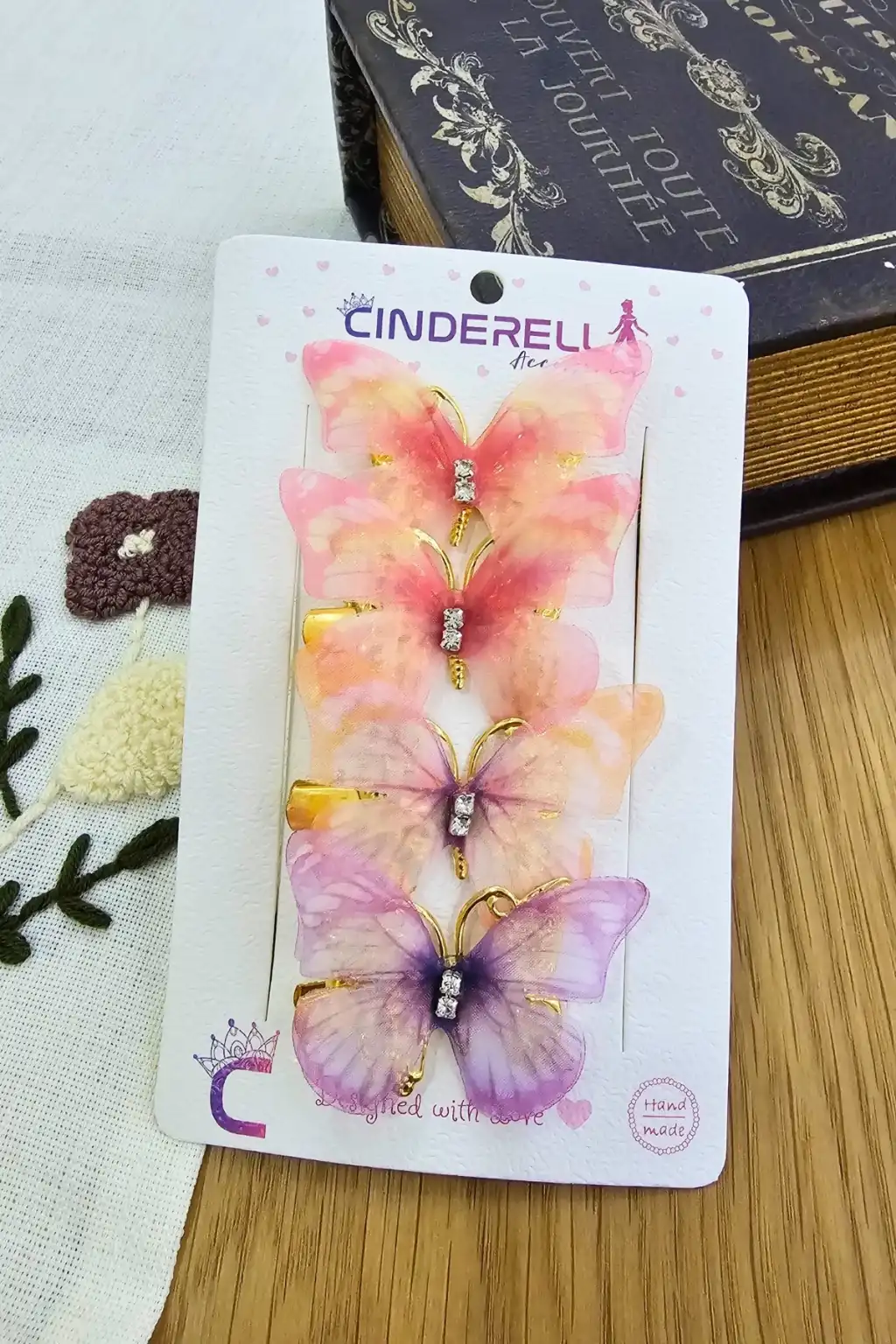 4'lü Özel Seri Tül Kanatlı Hareketli Taşlı Kelebek Toka Seti 5cm - Kız Çocuk Kelebekli Saç Tokası