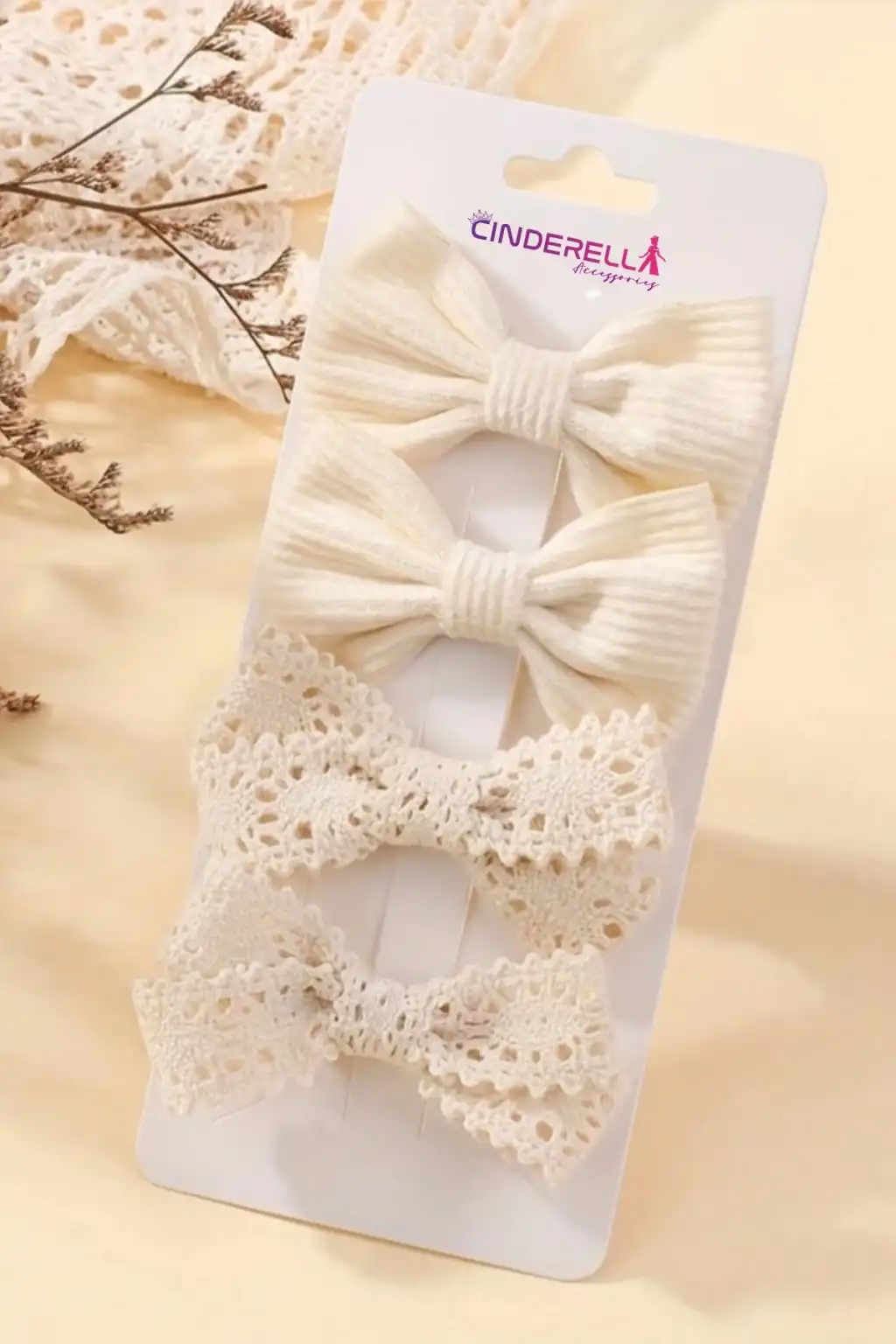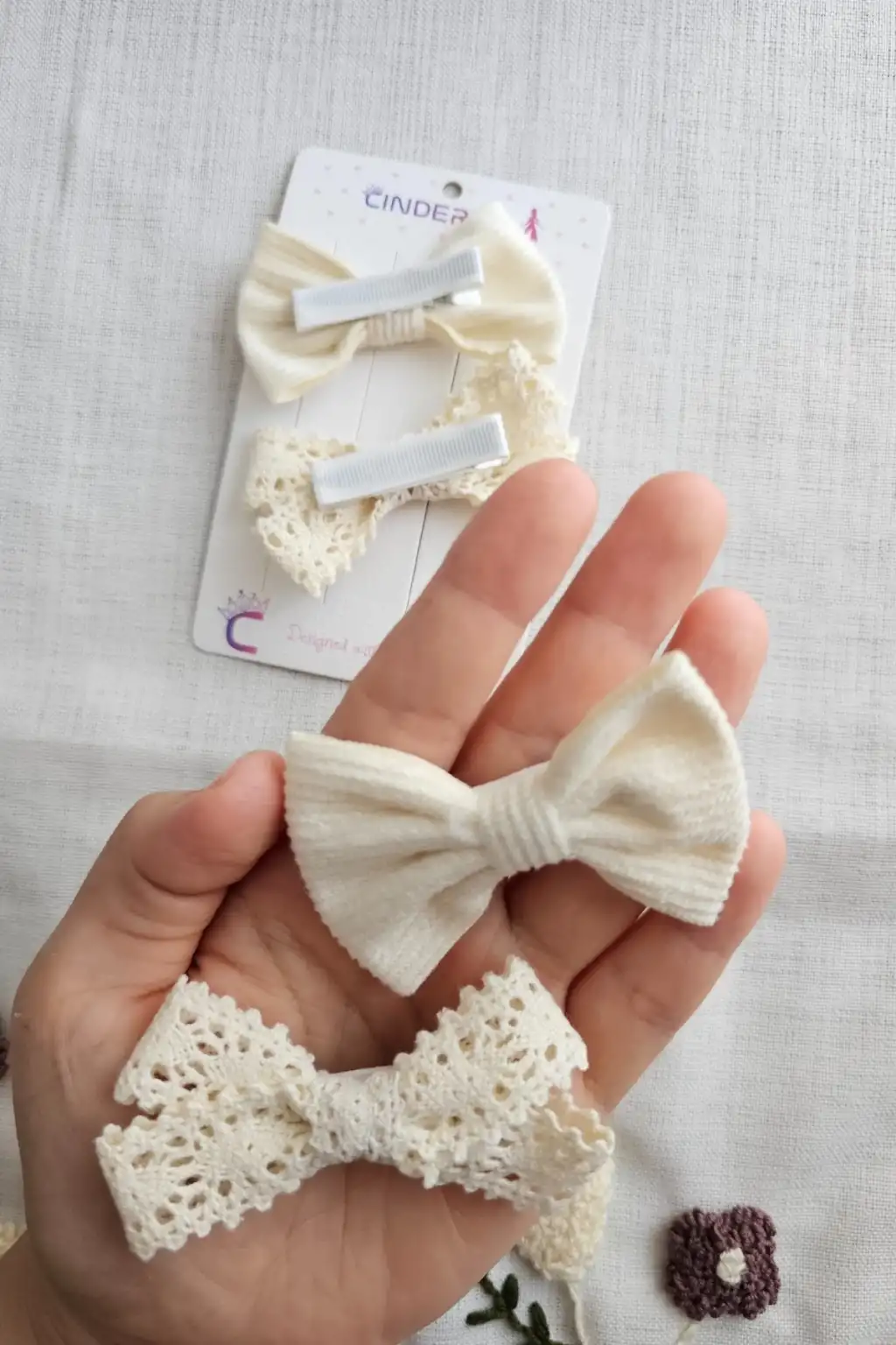 4'lü Şık Kombin Soft Bej Renkli Kız Bebek Yumuşak Pens Toka Seti - Çocuk Kurdeleli Fiyonk Saç Tokası