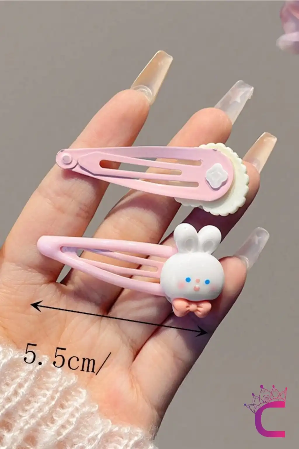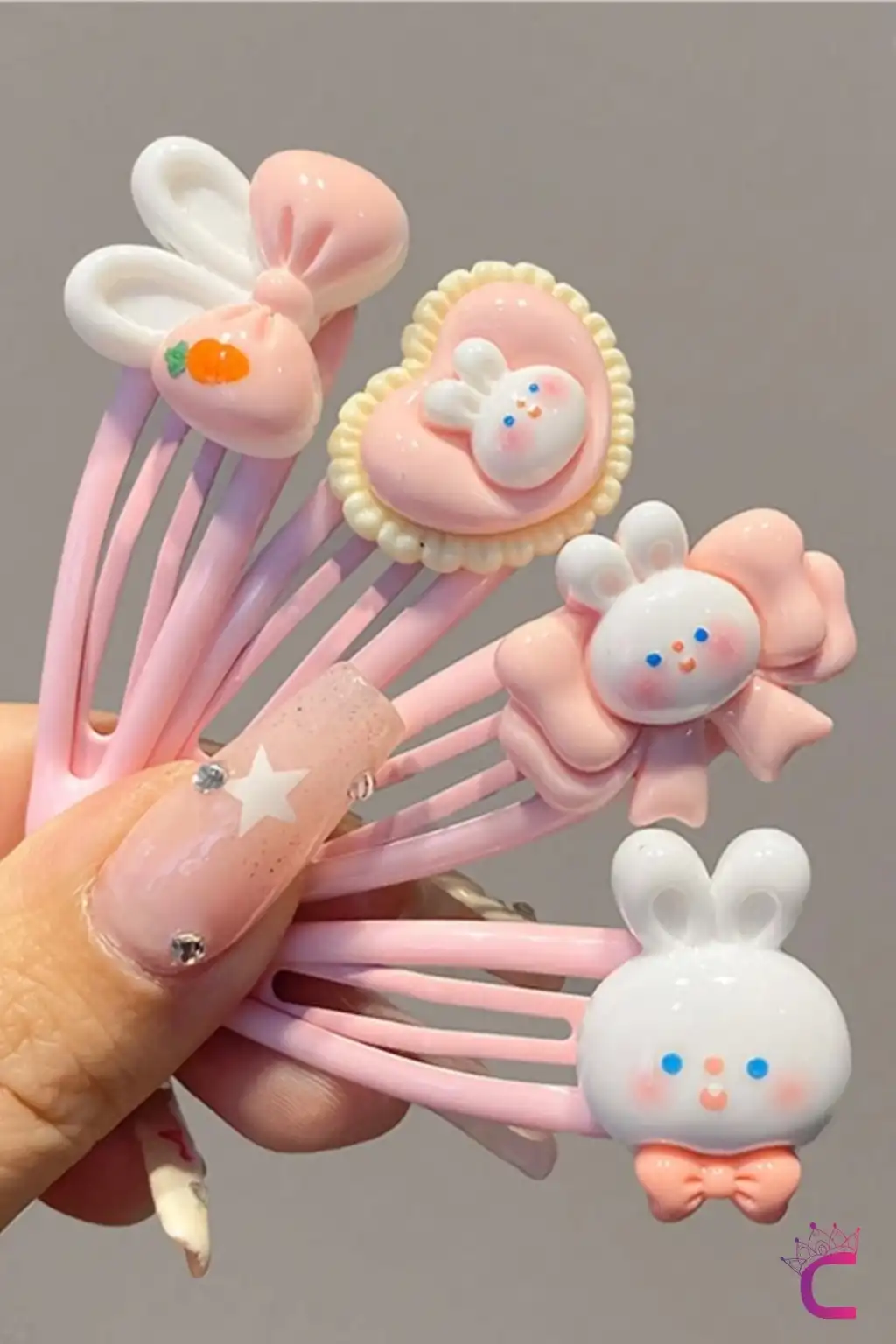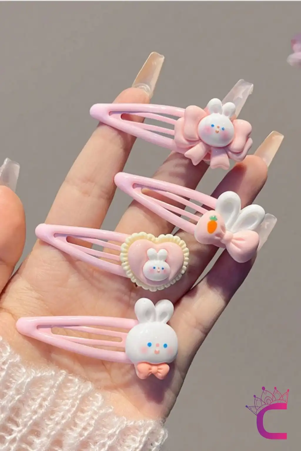 4'lü Tavşanlı Kalpli Kurdele Fiyonk Model Çıtçıtlı Toka Seti Pembe - Metal Çıtçıt Yan Saç Tokası