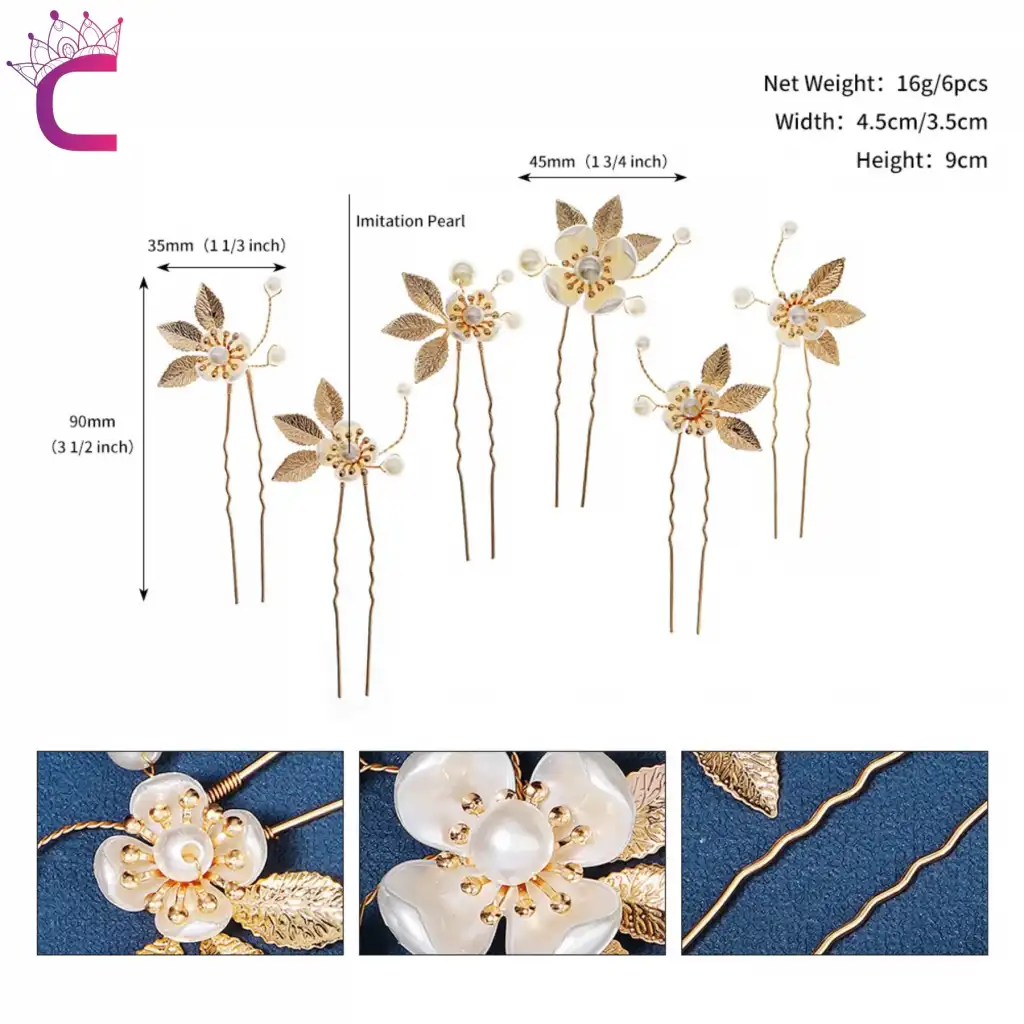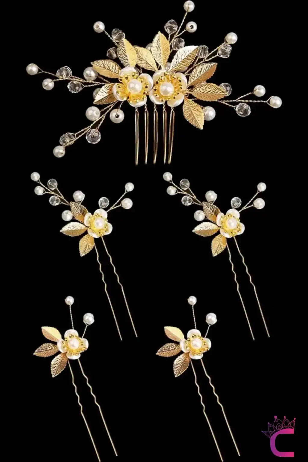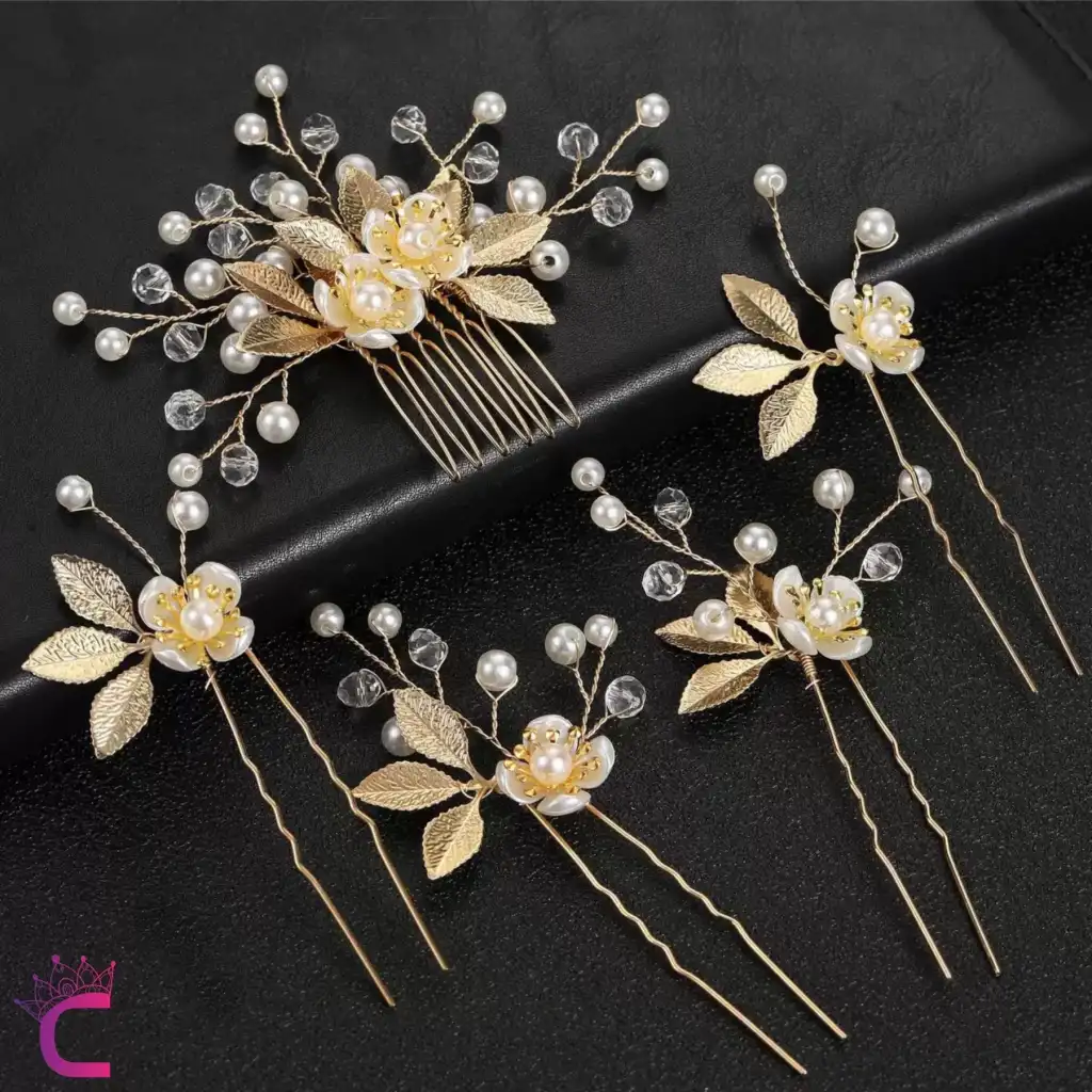 5'li İncili Çiçekli Taşlı Gold Yaprak Gelin Tacı Firkete Topuz Tokası - Düğün Nişan Saç Aksesuarı