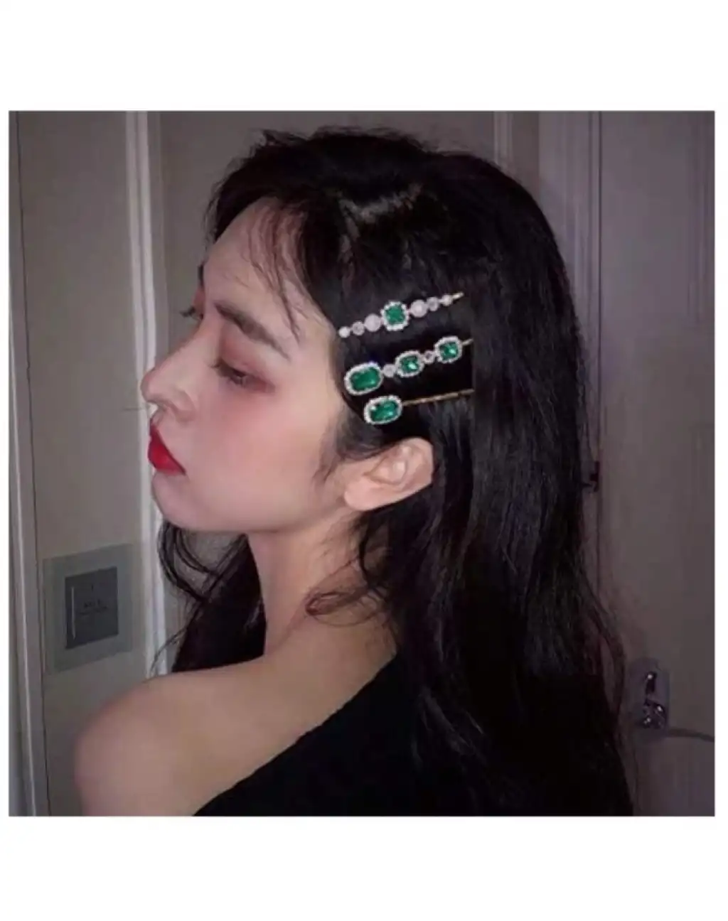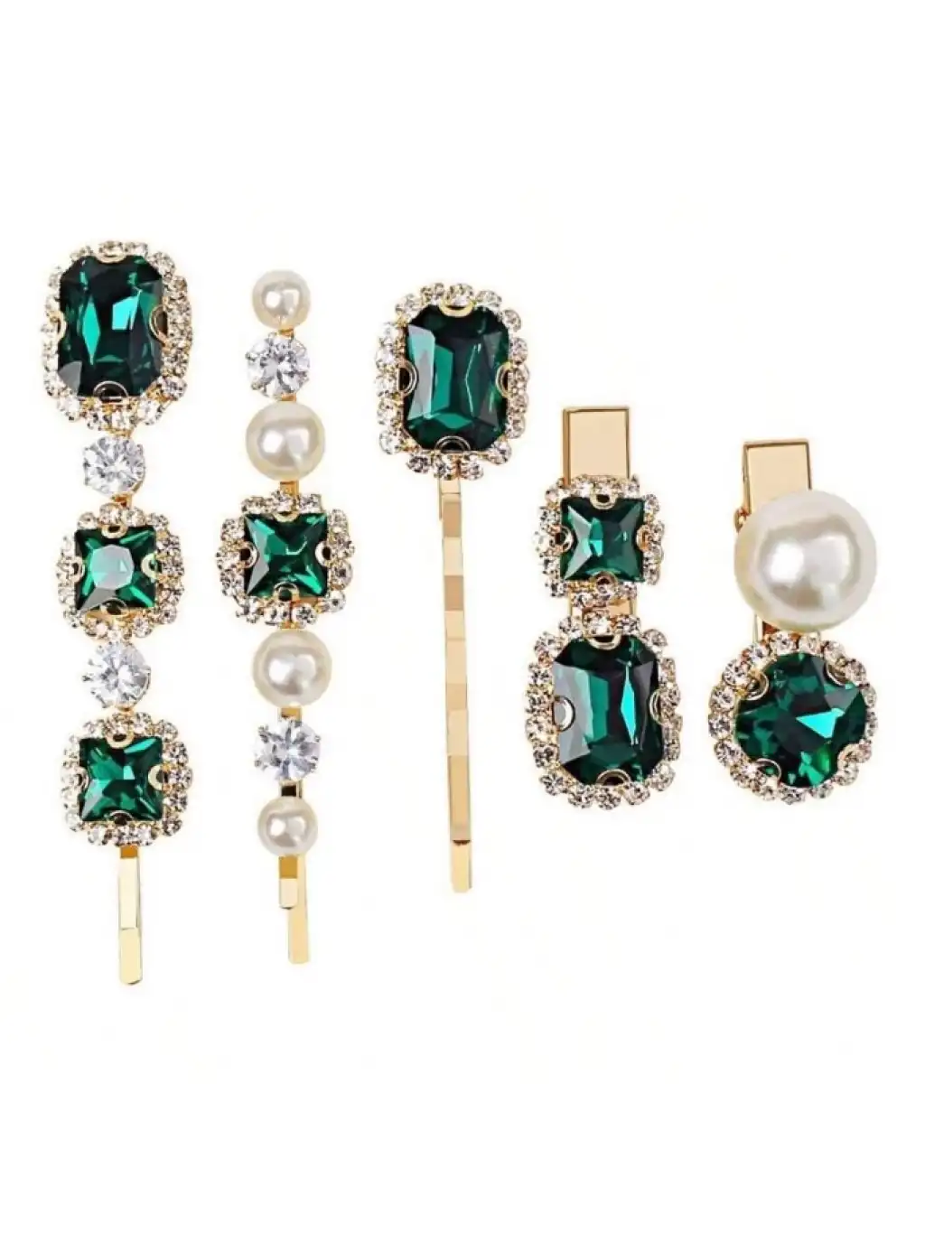 5'li Yeni Sezon Kadın Yeşil Taşlı Toka Seti - Lüks Yan Çıtçıt Klips Pens Toka Seti