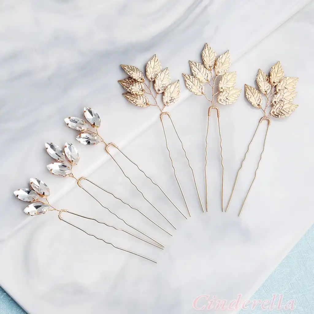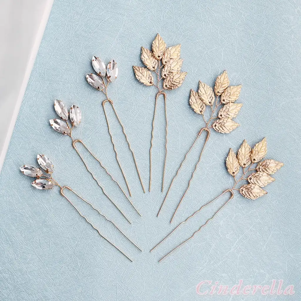 6'lı İncili Kristal Taşlı Gelin Tacı Firkete Toka Gold - Yaprak Taç Düğün Nişan Nikah Saç Aksesuarı