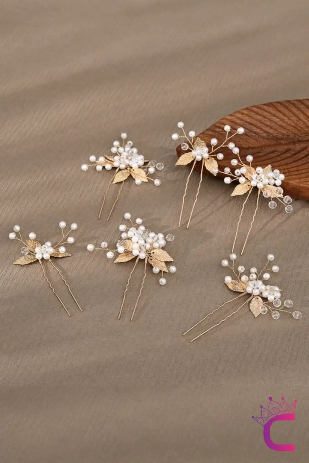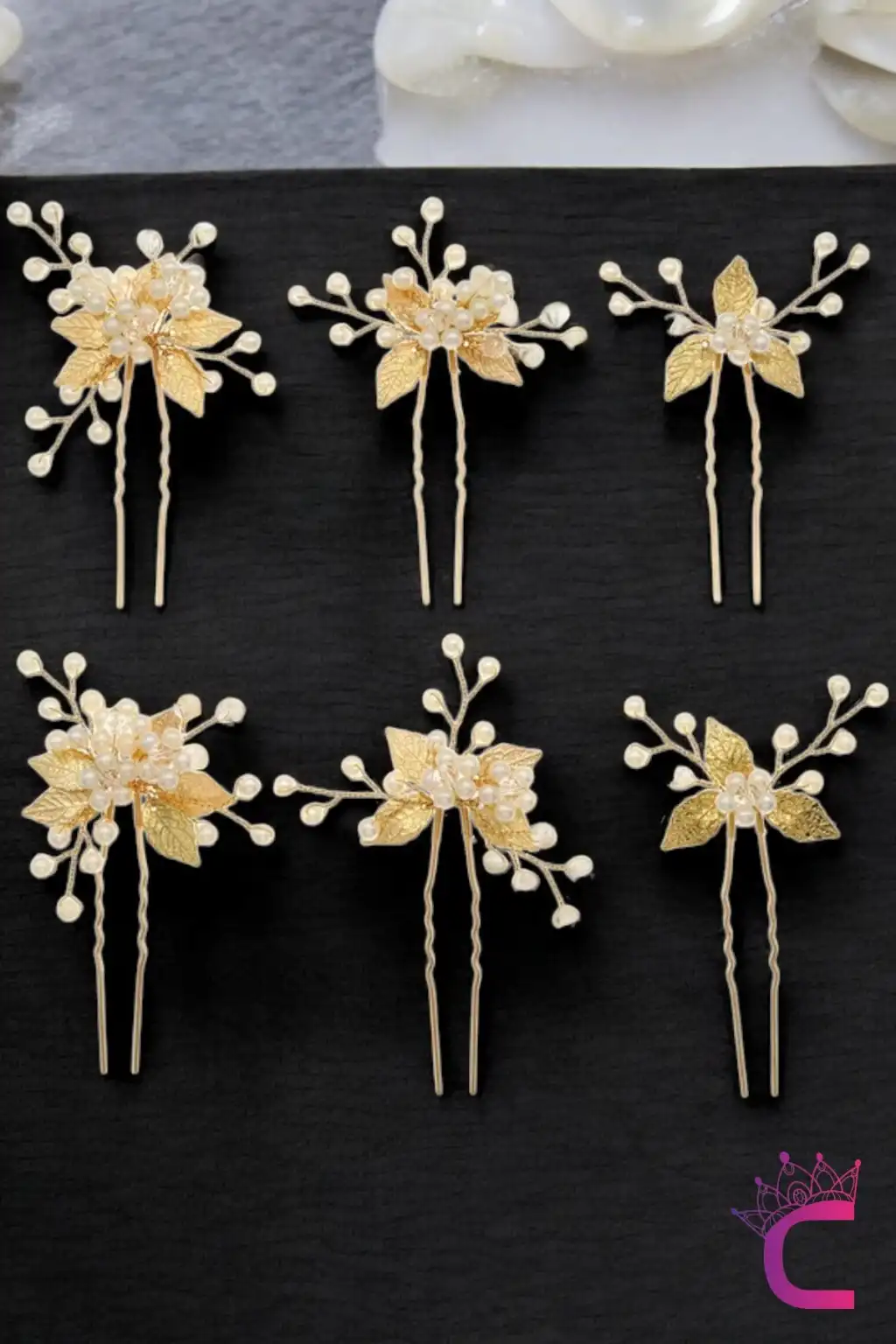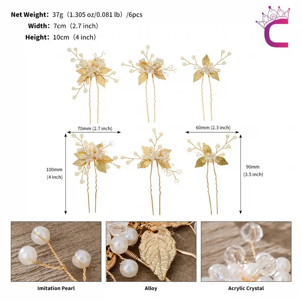 6'lı İncili Kristal Taşlı Gelin Tacı Firkete Toka Gold - Yaprak Taç Düğün Nişan Nikah Saç Aksesuarı