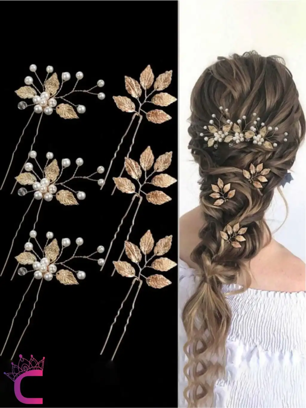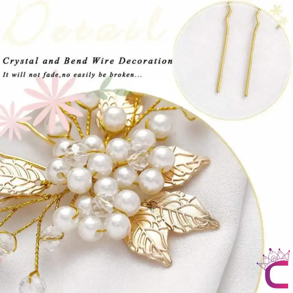 6'lı İncili Taşlı Çiçekli Gold Yaprak Gelin Tacı Firkete Topuz Toka - Düğün Nişan Nikah Saç Aksesuar