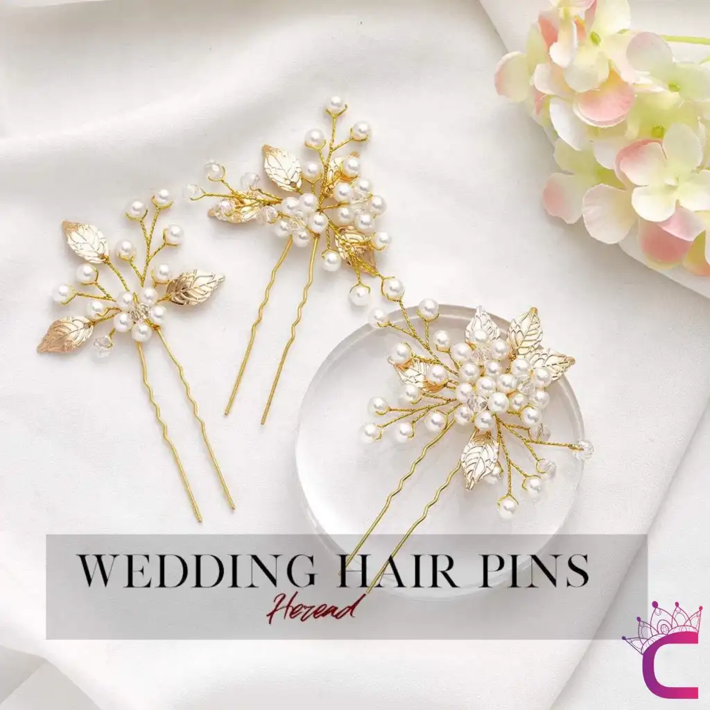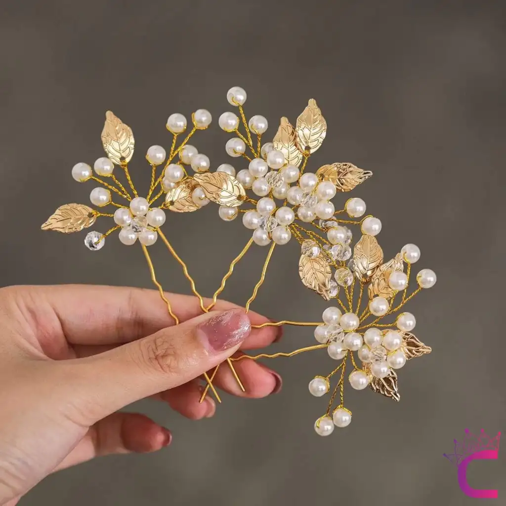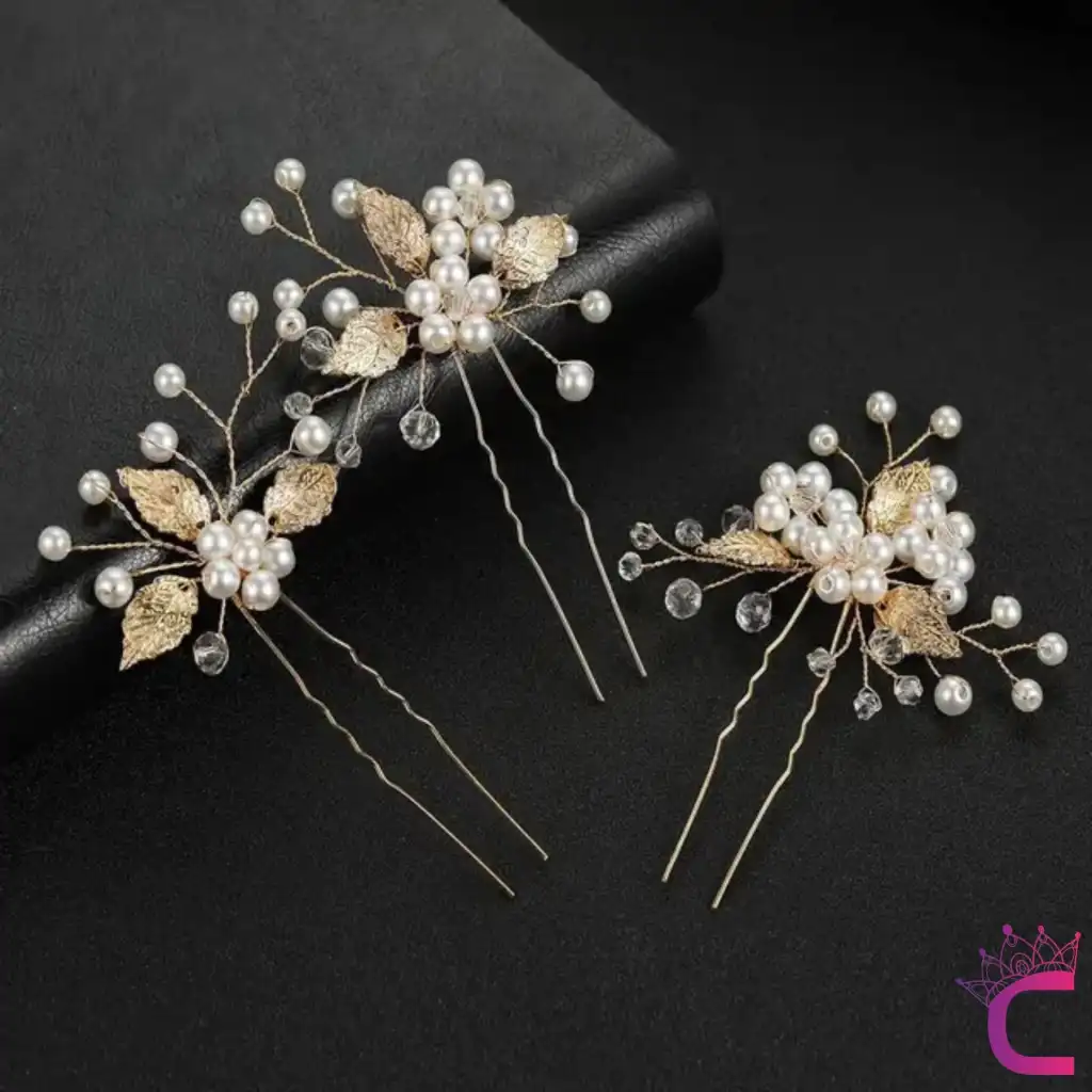 3'lü Zarif İncili Gelin Tacı Firkete Saç Topuz Tokası Gold - Düğün Nikah Nişan Söz Aksesuarı