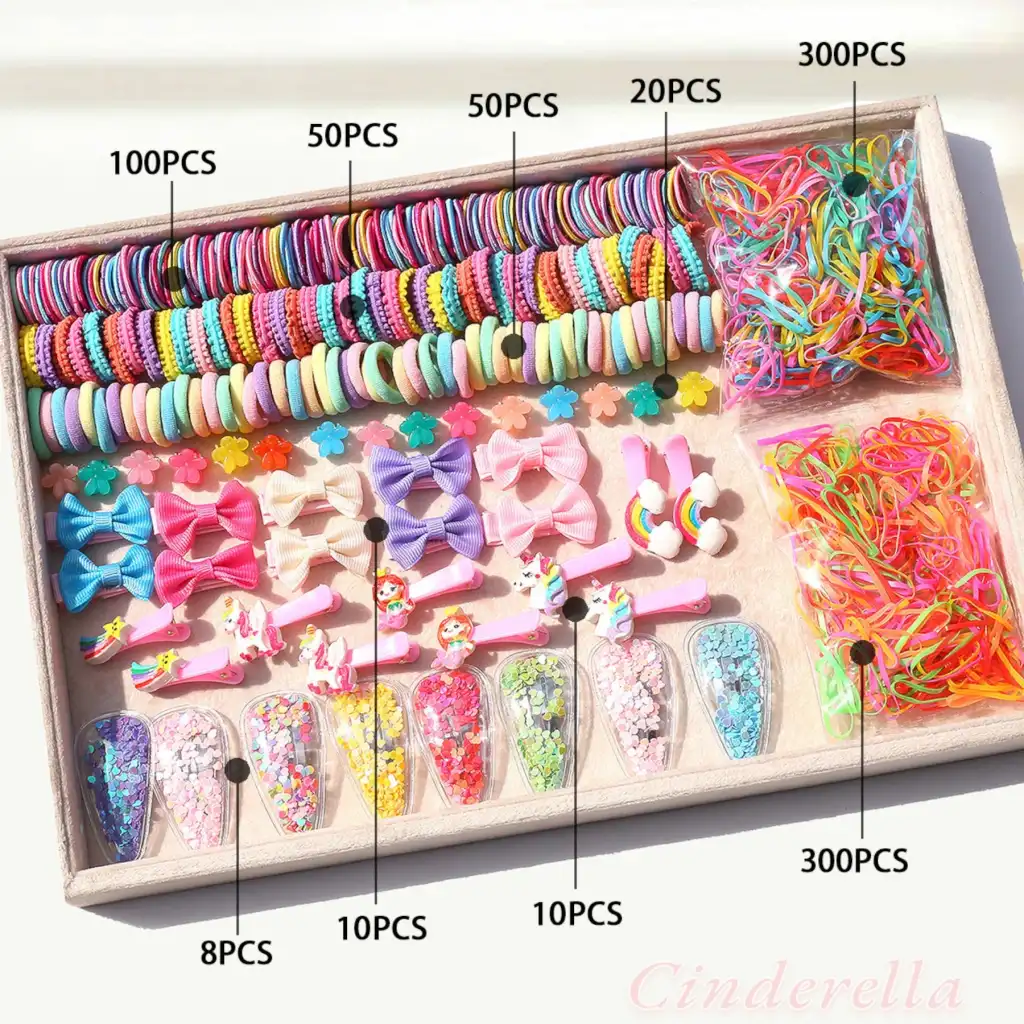 848 Parça Hediyelik Kutulu Çocuk Toka Seti - Lastikli Fiyonk Gökkuşağı Unicorn Çıt Çıt Saç Tokası