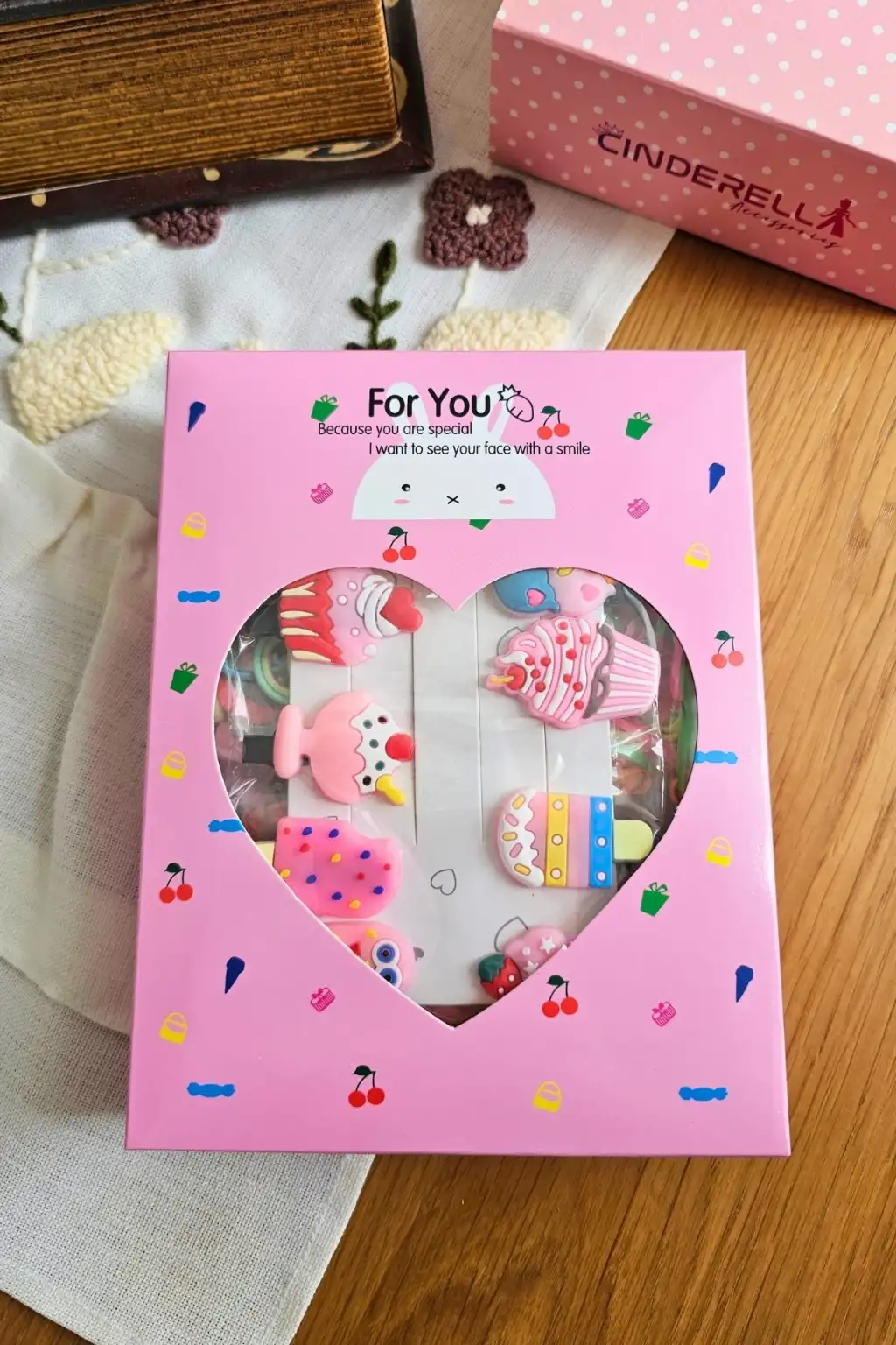 - Kız çocukların hayal dünyasına hitap eden unicorn, fiyonk ve yıldız desenleriyle süslenmiş şık aksesuarlar.