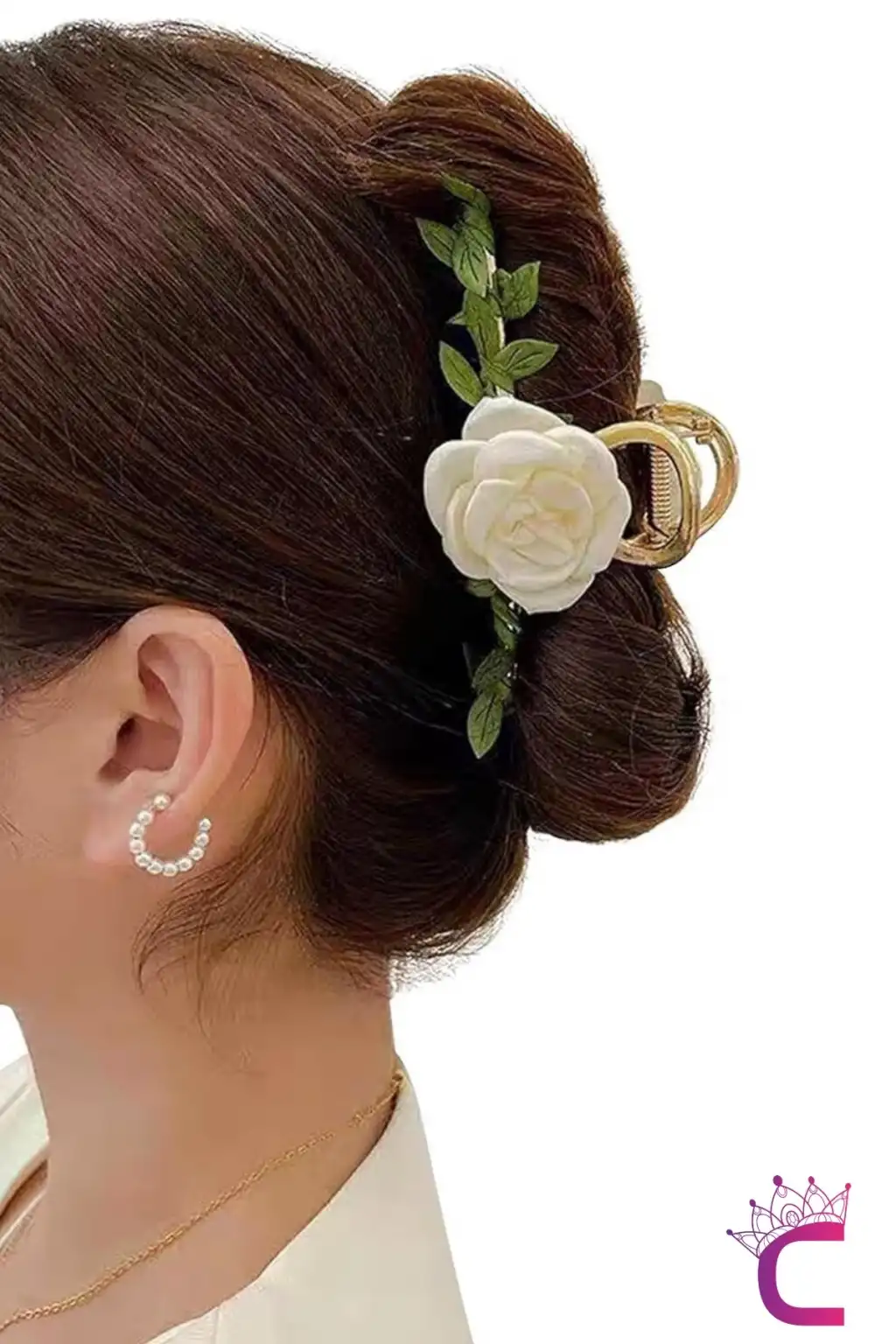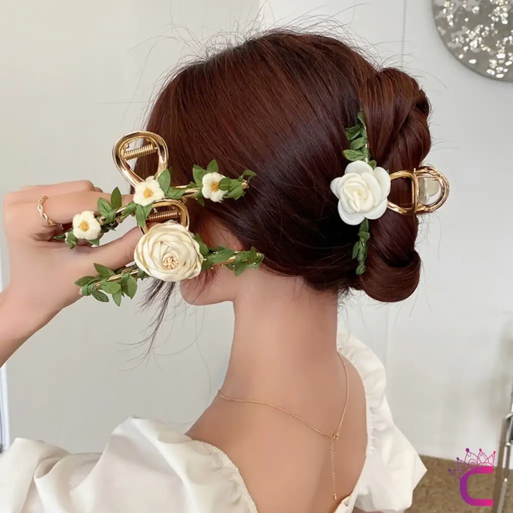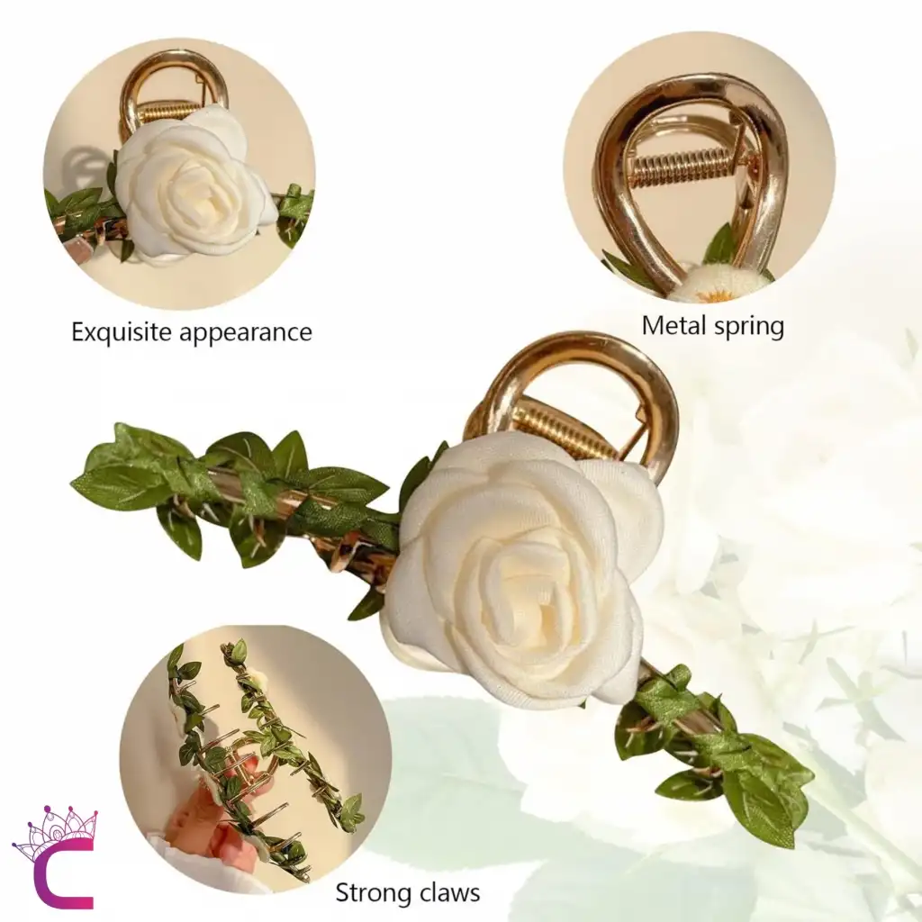 Beyaz Kamelya Çiçekli Sarmaşık Yapraklı Kadın Metal Mandal Toka Gold 11.5cm - Hediyelik Saç Tokası