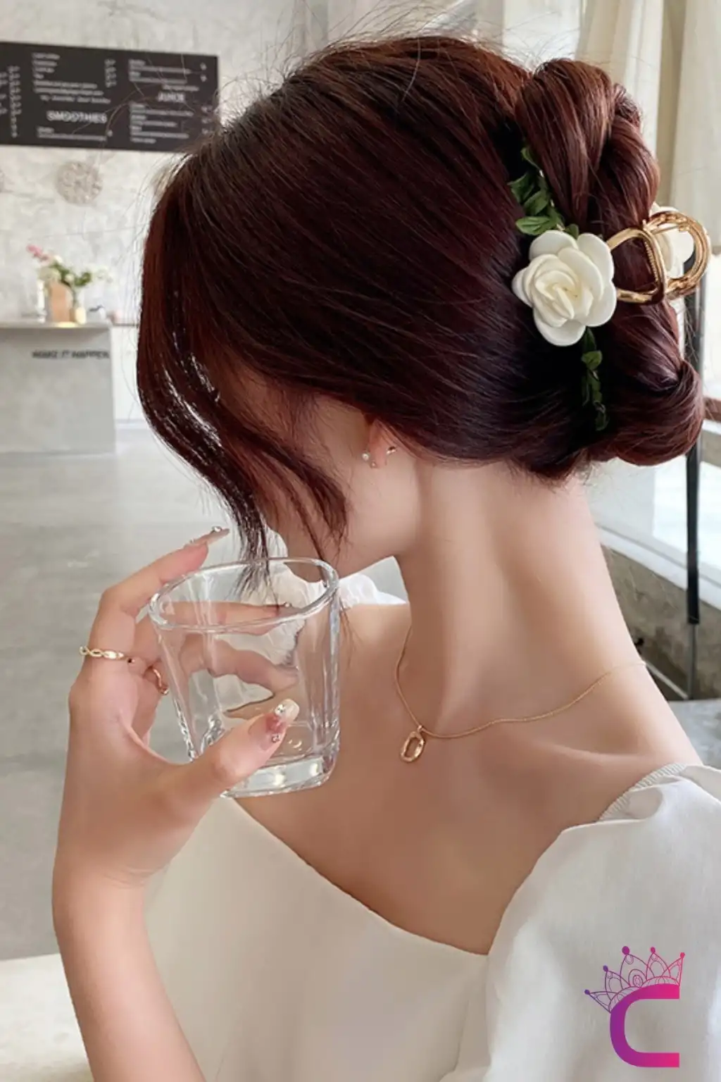 - Zarif tasarımıyla dikkat çeken beyaz kamelya çiçekleri, sarımsı yaprakları ve altın rengi mandal tokası ile şıklığınızı tamamlar.