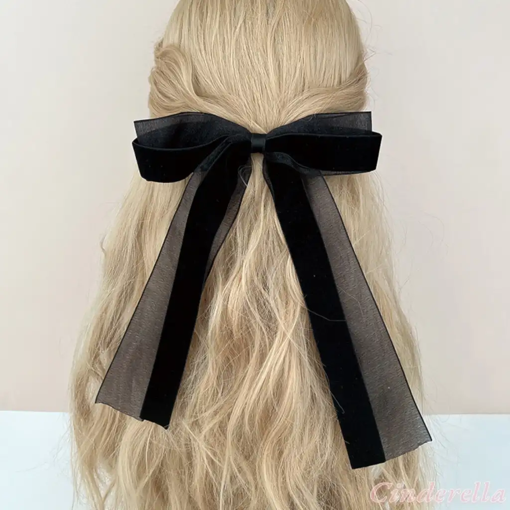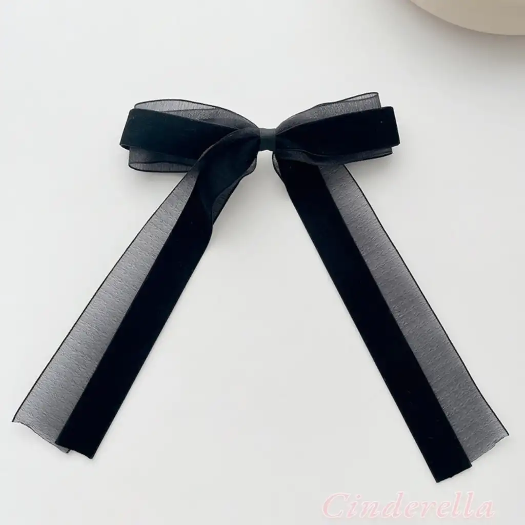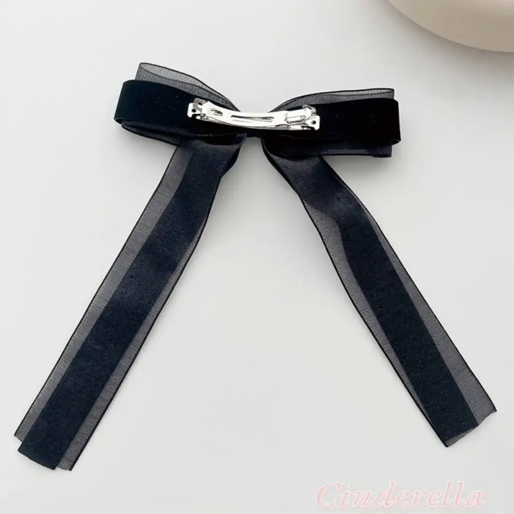 Çift Fiyonklu Tül Mat Kadife Kumaş Fiyonk Otomatik Toka Siyah - Kurdele Fiyonklu Klipsli Saç Tokası