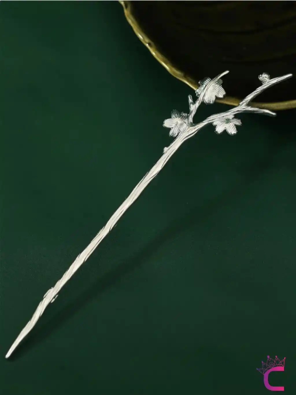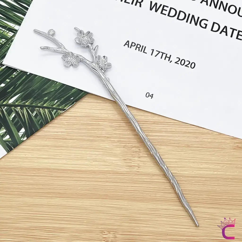 Dal Tasarım Çiçekli Japon Topuz Tokası 18cm Gümüş Renk - Vintage Kadın Metal Saç Çubuk Topuz Tokası