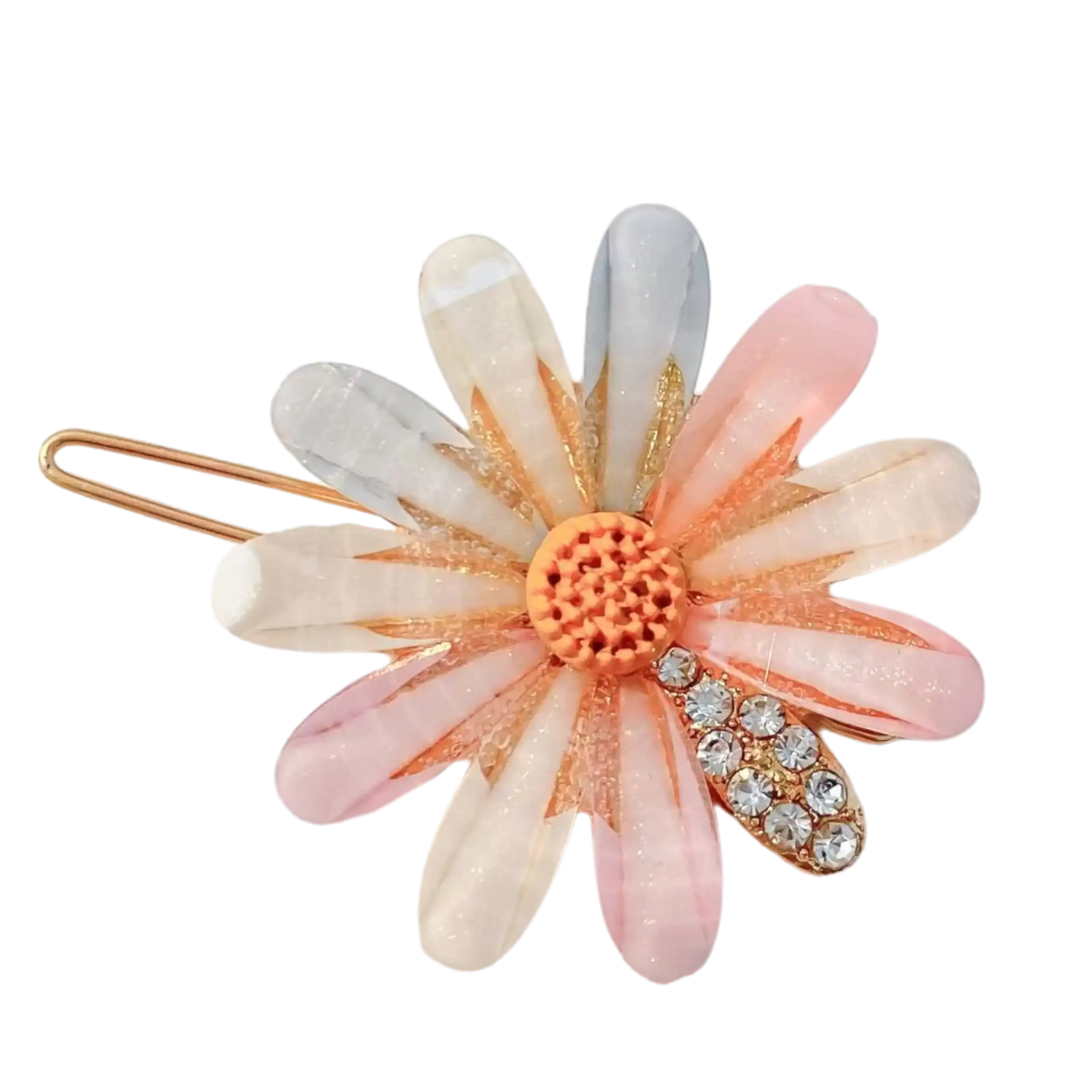 Zarif Papatya Çiçekli Zirkon Taşlı Yapraklı Gold Kadın Mandal Toka 10 cm - Metal Mandallı Saç Tokası