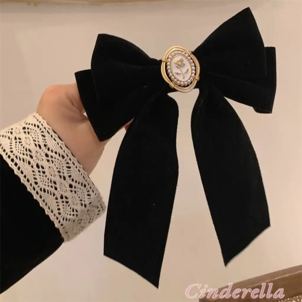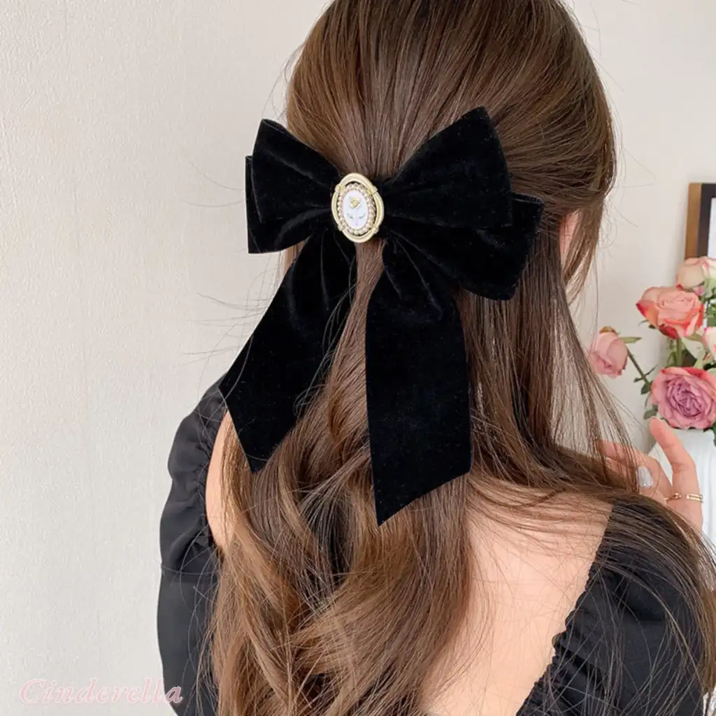 İncili Çiçek Gül Detaylı Siyah Mat Kadife Fiyonk Otomatik Toka - Zarif Fiyonklu Kadın Saç Tokası