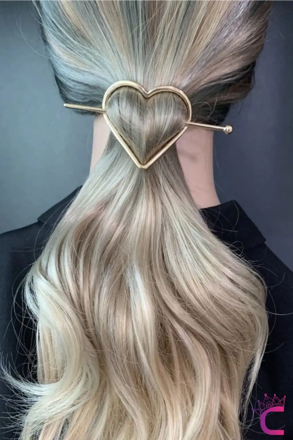 - Zarif tasarımıyla dikkat çeken kalp şeklindeki gold metal topuz tokası, saç aksesuarlarına şıklık katıyor.