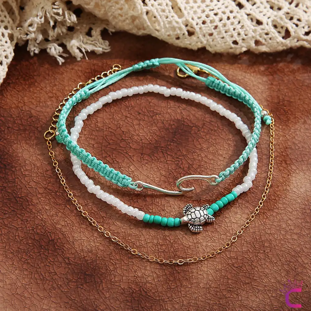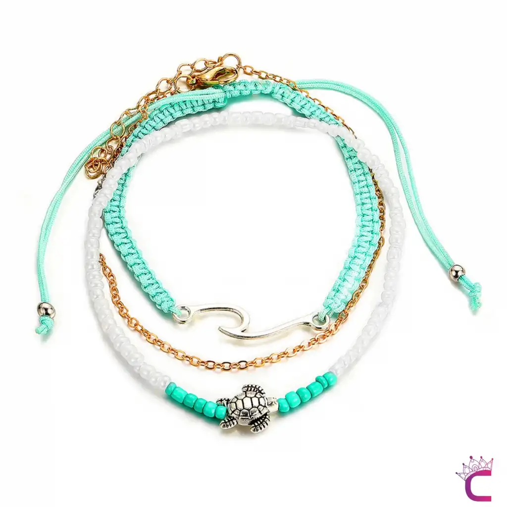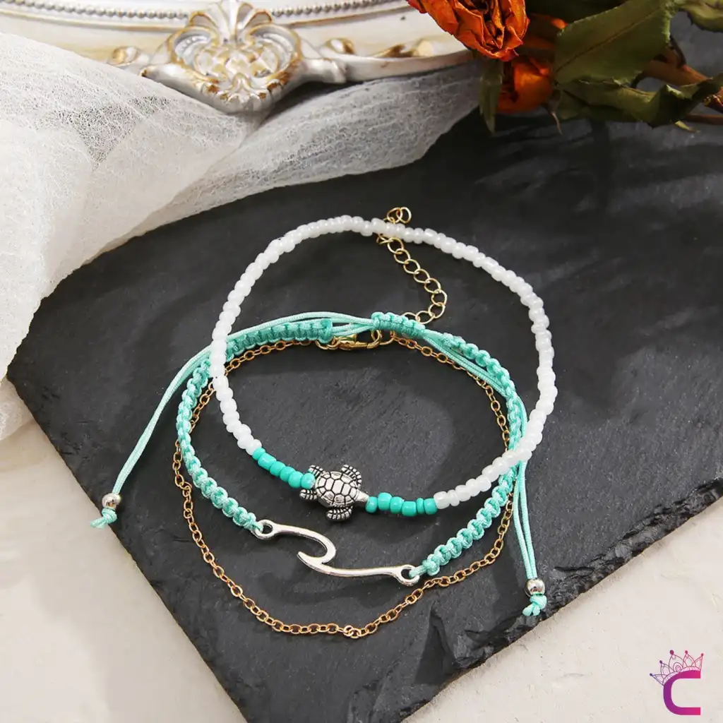 Karetta Figürlü Örgü İpli Miyuki Taşlı Zincirli 3'lü Kombin Halhal - Ayarlanabilir İp Halhal