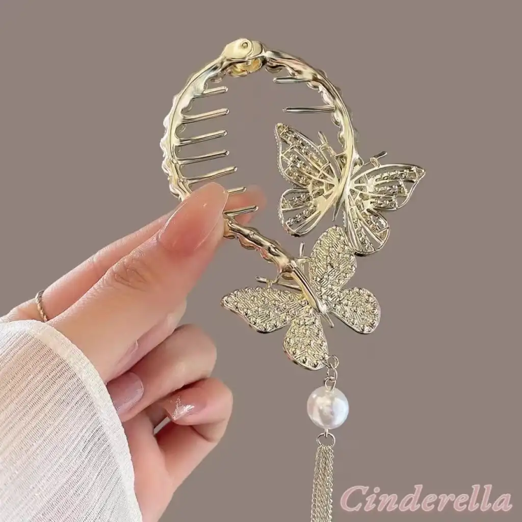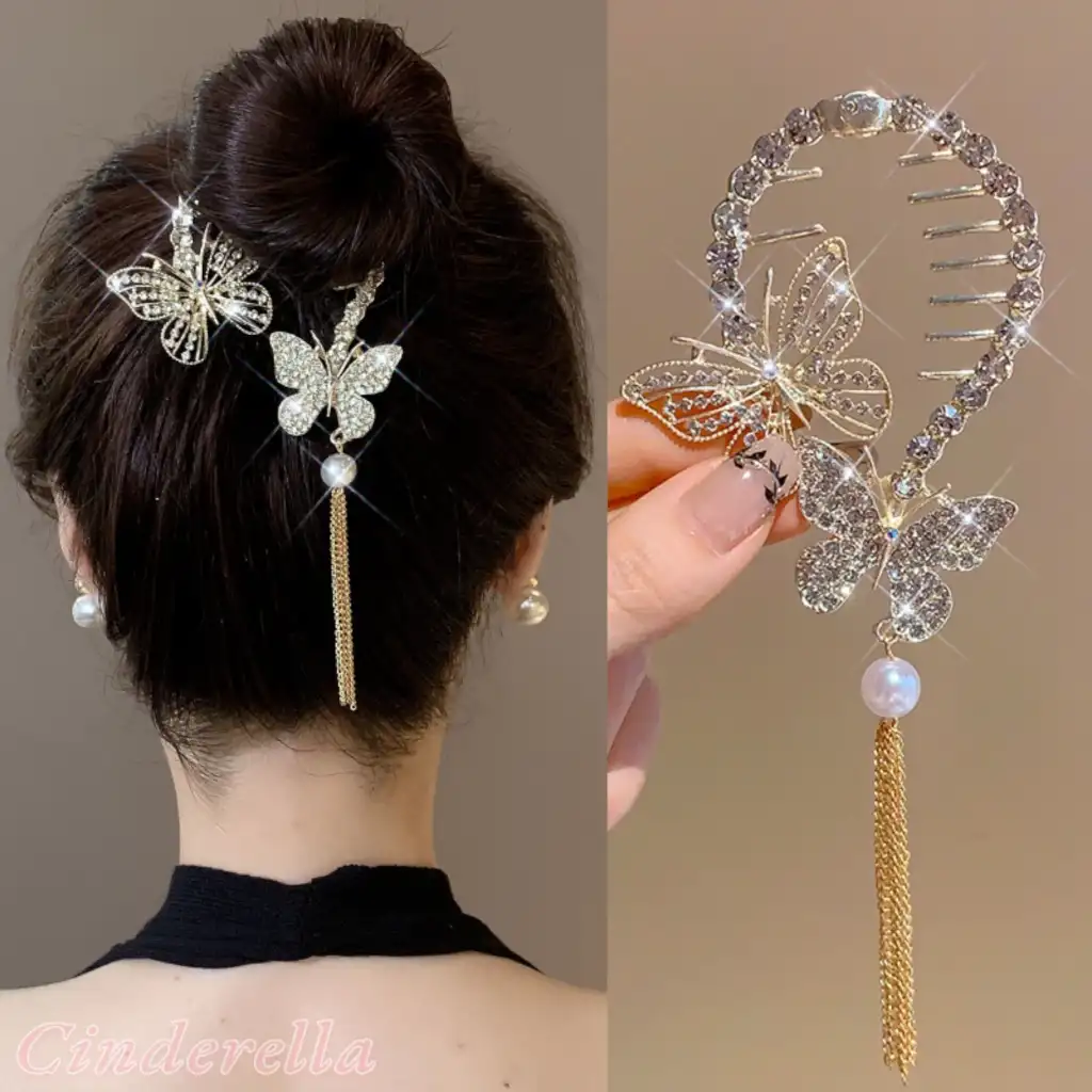 Kelebekli Kadın Topuz Saç Tokası Gold Metal - Yeni Tarz Sallantılı İncili Kristal Taşlı Toka
