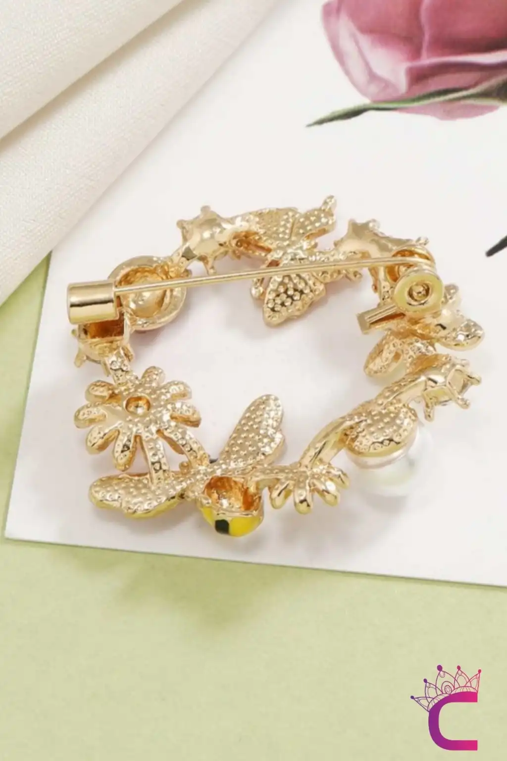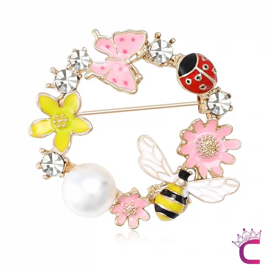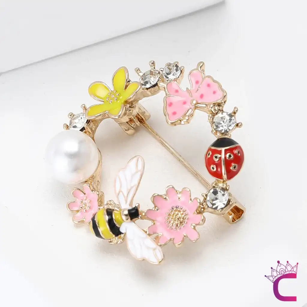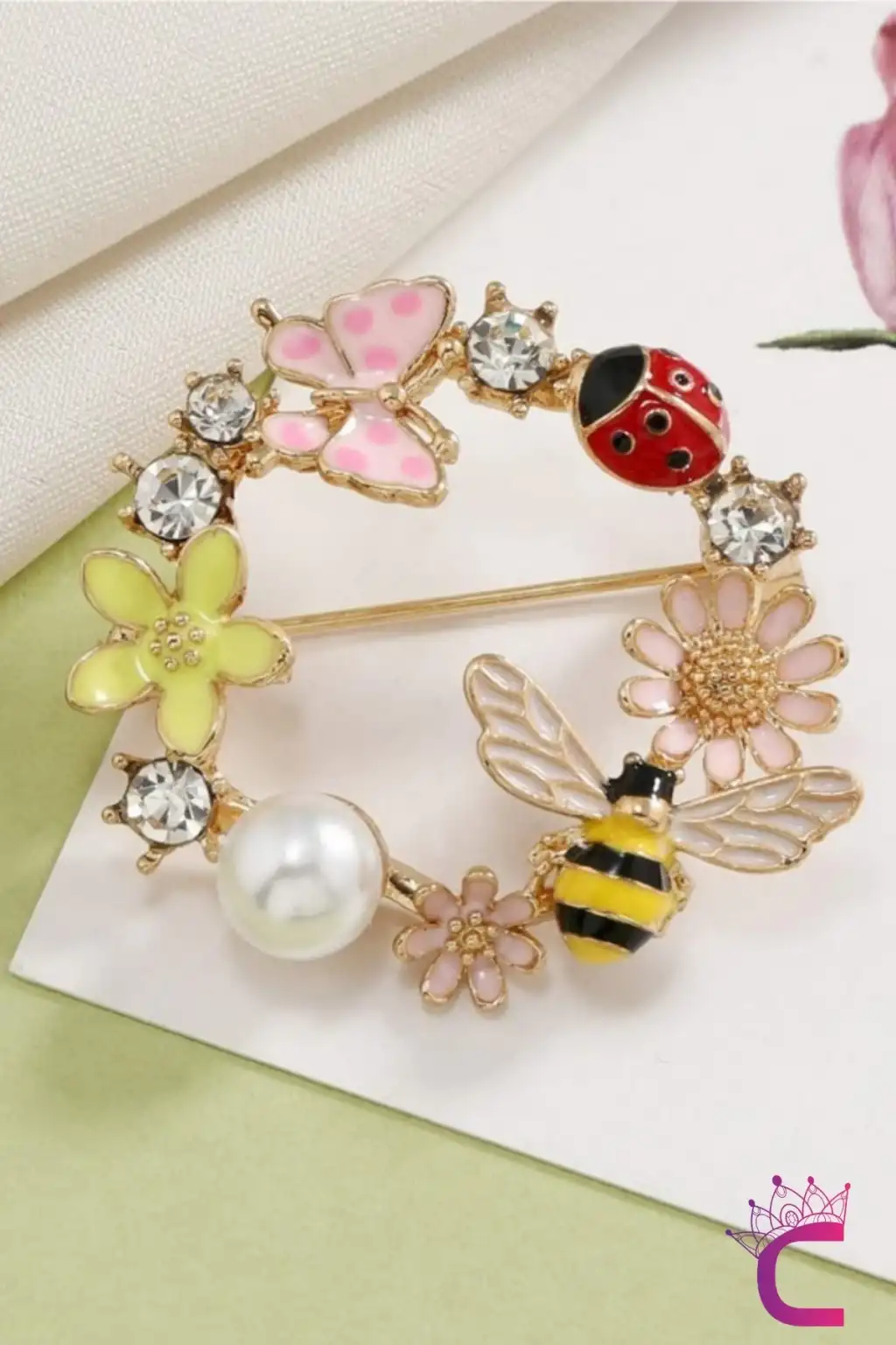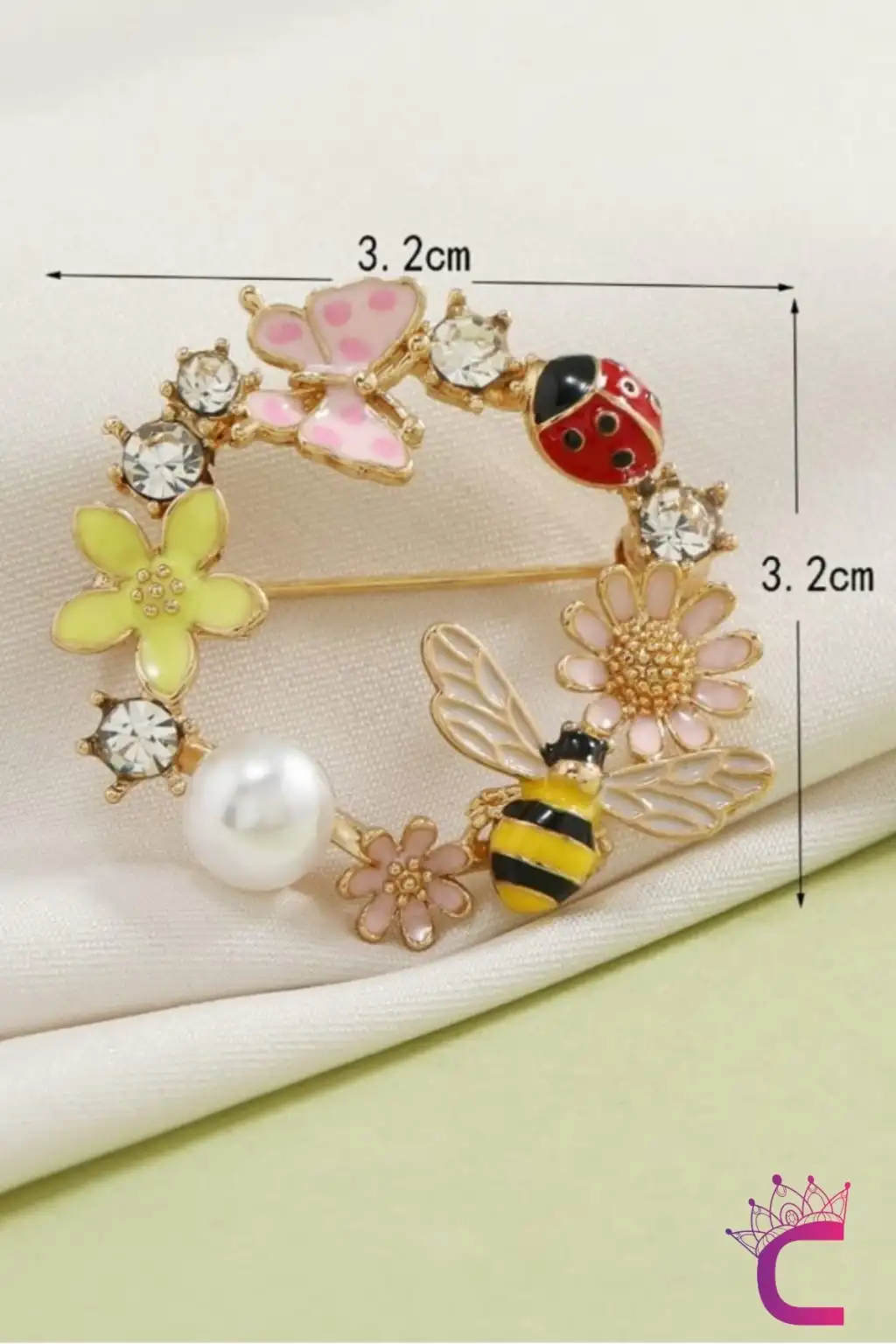 Kelebekli Uğur Böceği Arılı İncili Çiçekli Kadın Çelenk Broş - Hediyelik Elbise Ceket Yaka İğnesi