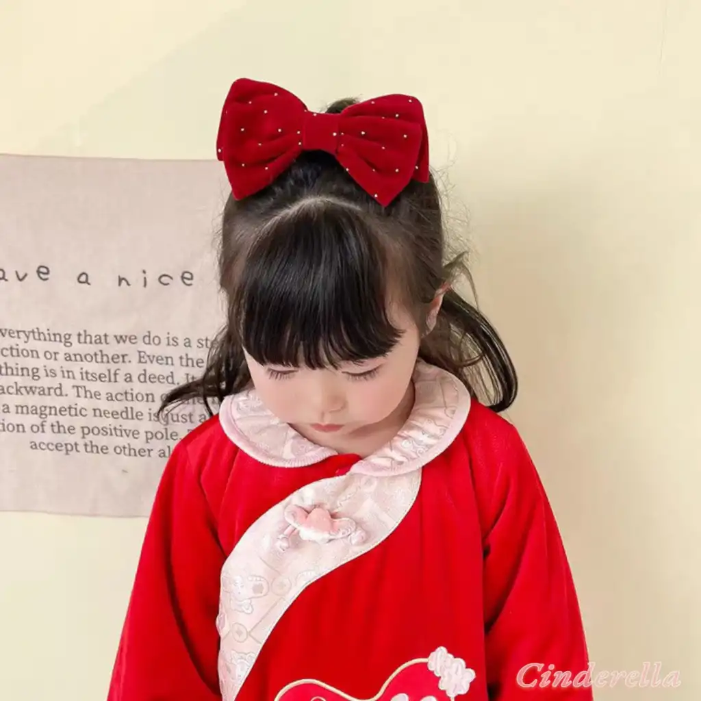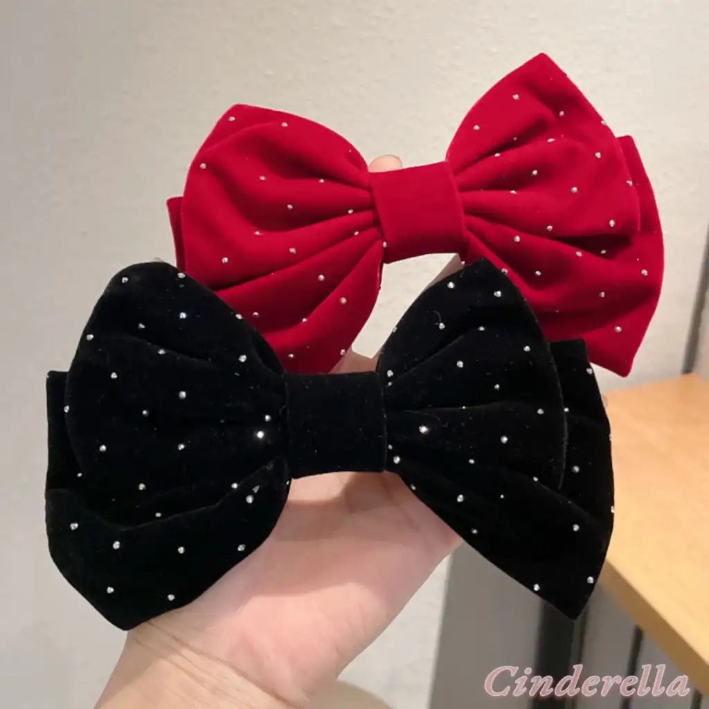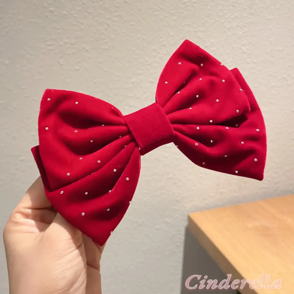 Mini Parlak Taşlı Mat Kadife Fiyonk Otomatik Toka Kırmızı - Zarif Fiyonklu Kurdele Kadın Saç Tokası