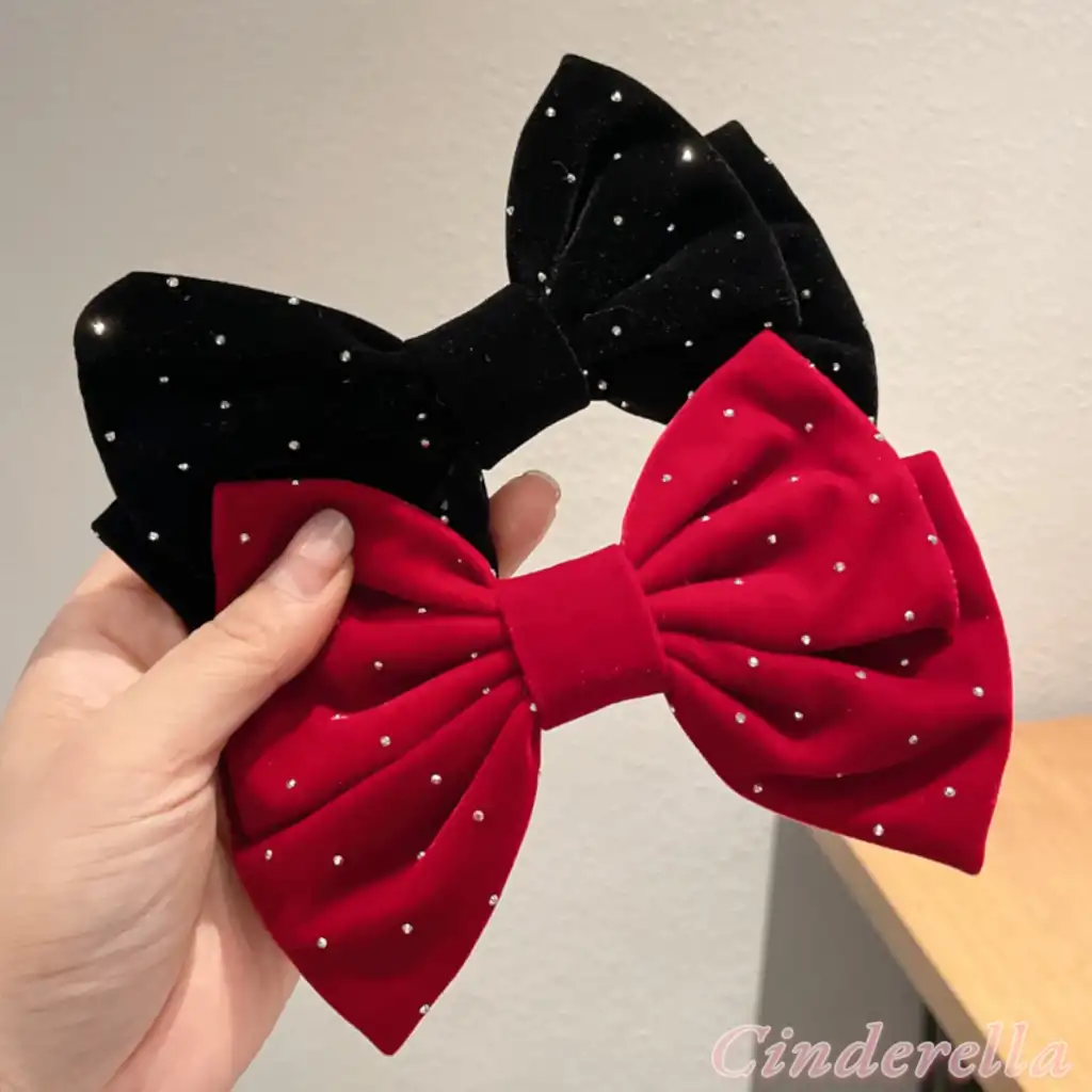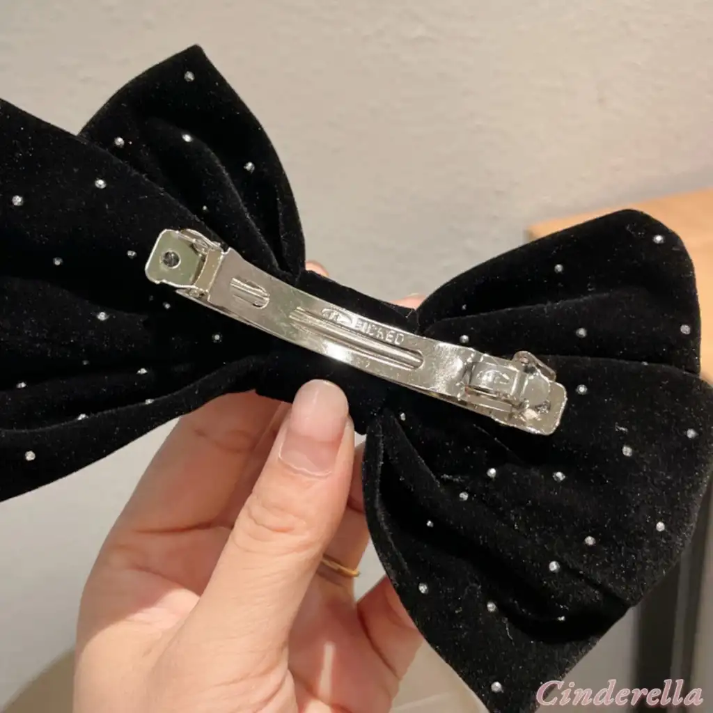 Mini Parlak Taşlı Mat Kadife Fiyonk Otomatik Toka Siyah - Zarif Fiyonklu Kurdele Kadın Saç Tokası
