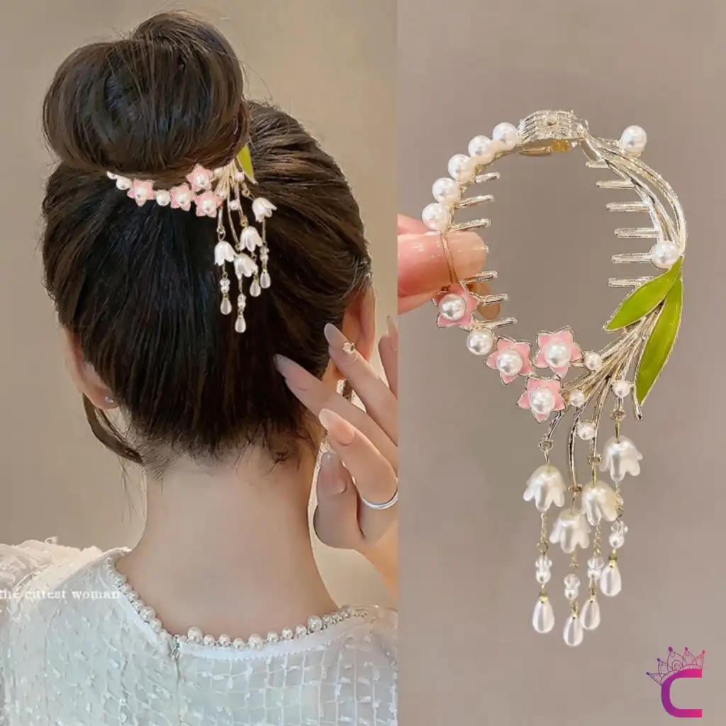 Minik Pembe Çiçekli Yaprak Detaylı İncili Taşlı Sallantılı Yaylı Kadın Saç Topuz Tokası Gold Metal