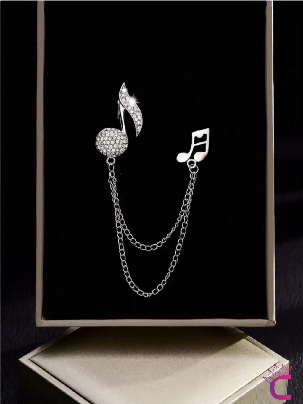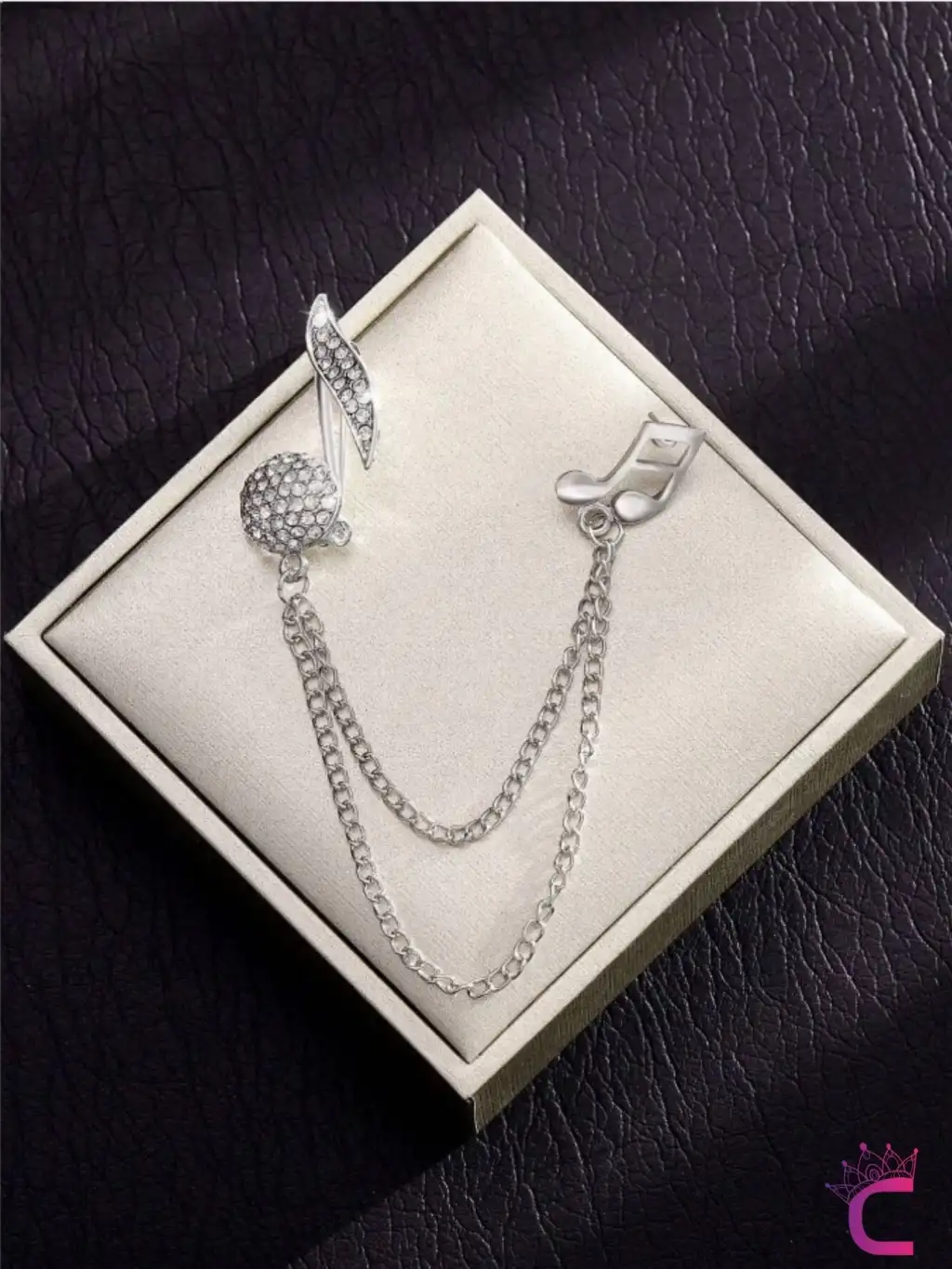 Müzik Notası Zirkon Taşlı Zincirli Broş Gümüş - Hediyelik Damat Yaka Zinciri Ceket Kıyafet İğnesi