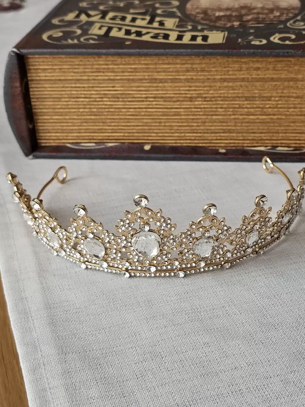Özel Seri Kristal Su Damlası Zirkon Taşlı Prenses Gelin Tacı Gold - Kraliçe Helen Düğün Nikah Taç