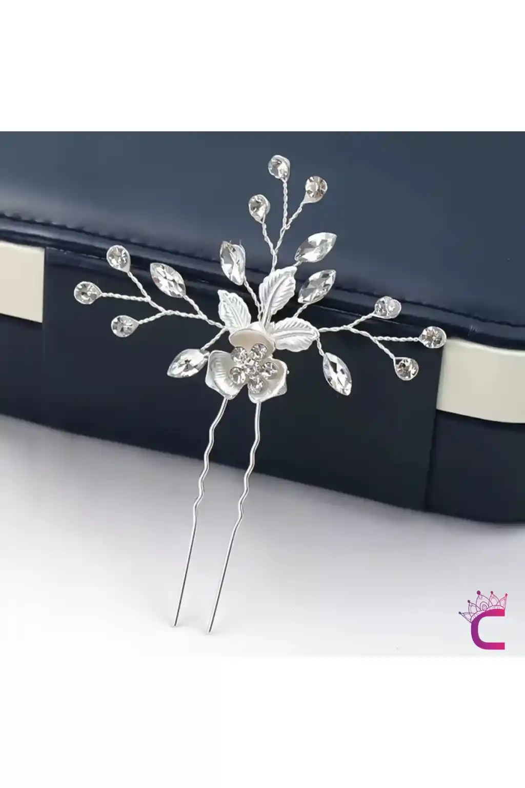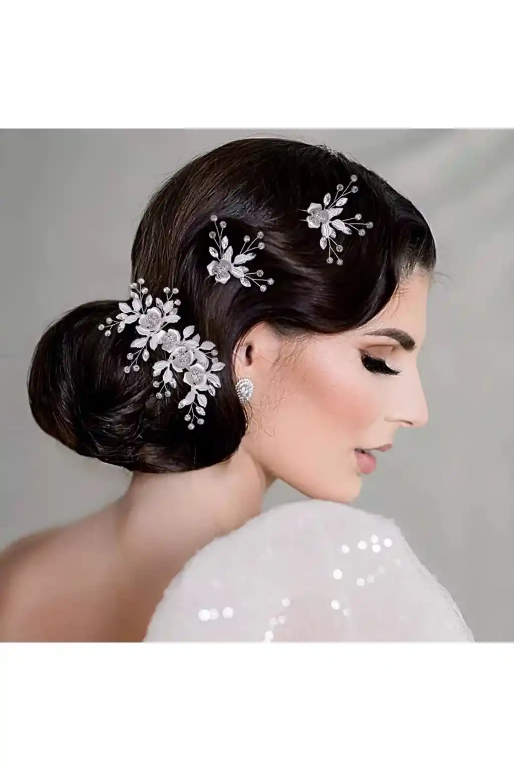 10'lu Mini Kristal Taşlı Çiçek Tasarım Firkete Toka Gümüş - Düğün Nikah Saç Aksesuarı Topuz Tokası
