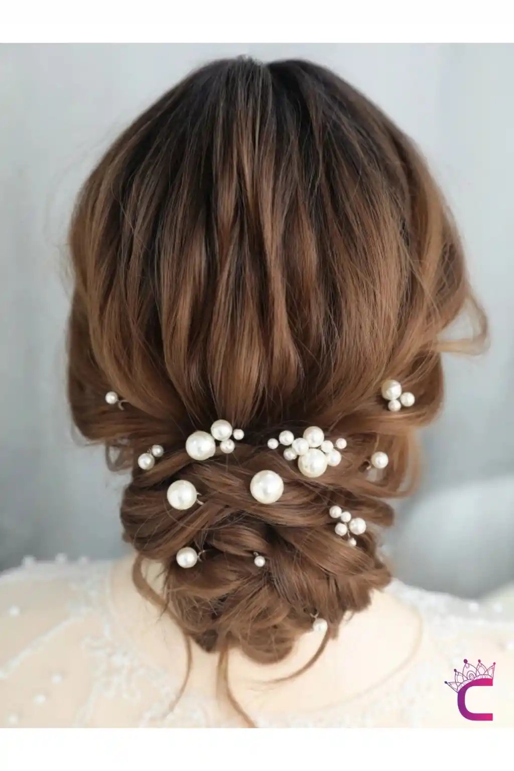 5'li Zarif Beyaz Sedef İnci Çiçekli Gold Yaprak Gelin Tacı Firkete Toka - Düğün Saç Topuz Tokası