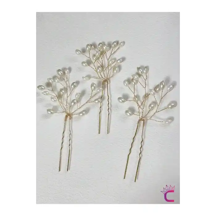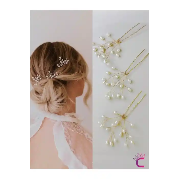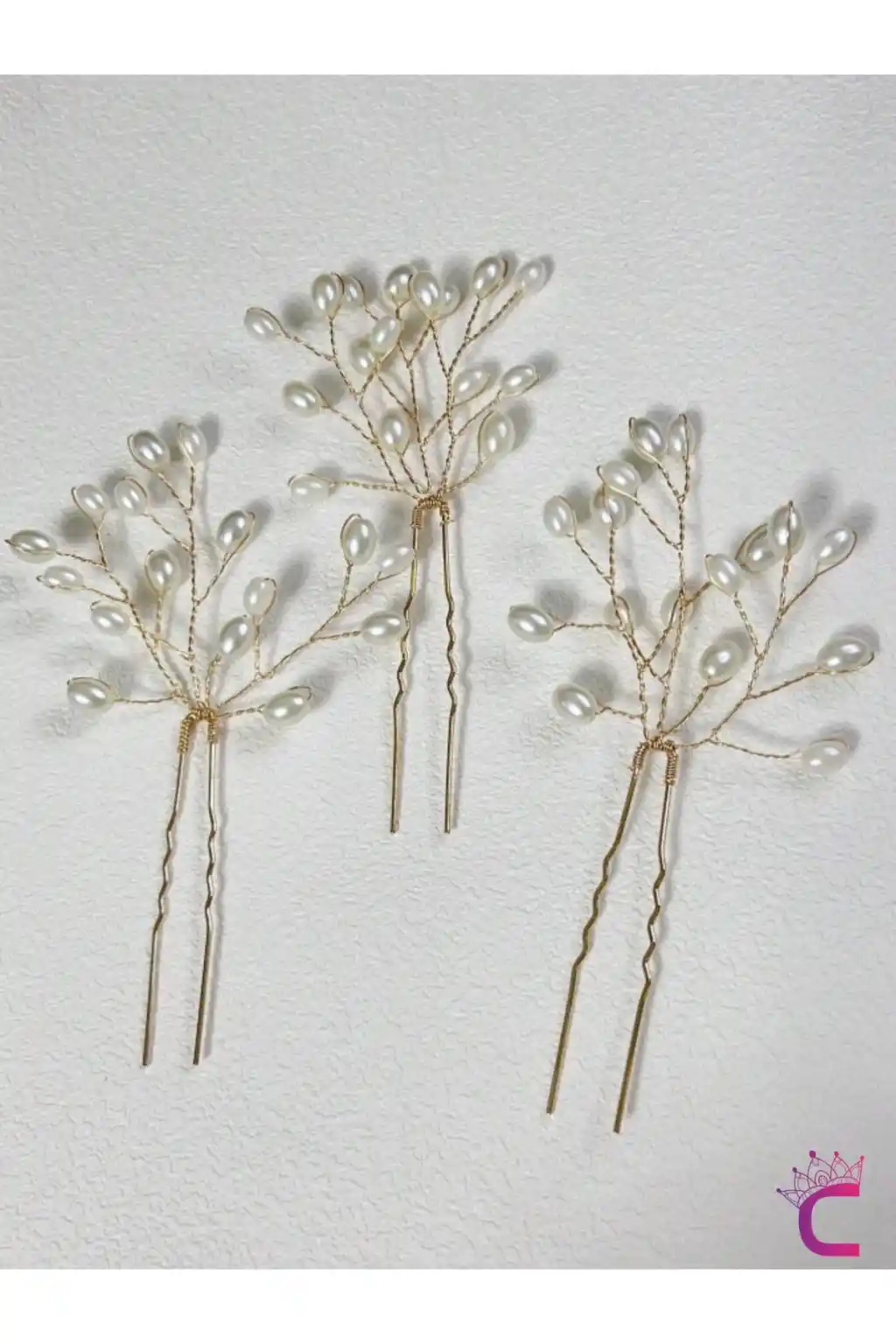 3'lü Zarif İncili Kristal Taşlı Gelin Tacı Firkete Toka Gold - Düğün Nişan Nikah Söz Saç Aksesuarı
