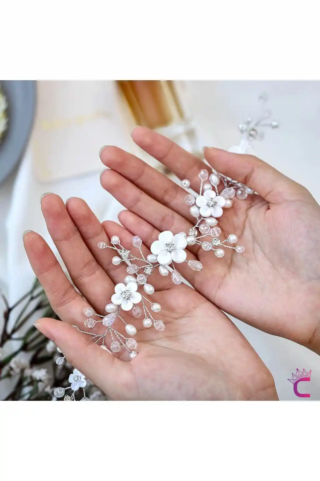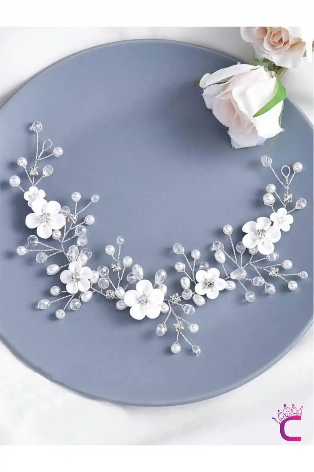 Zarif Beyaz Çiçekli İncili Gelin Tacı Gümüş - Helen Saç Bandı Topuz Tokası Düğün Nişan Aksesuarı
