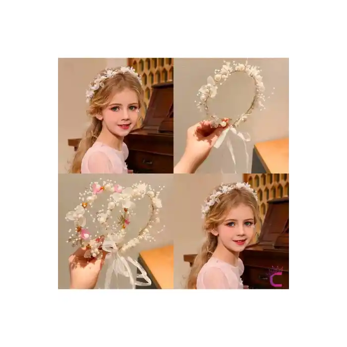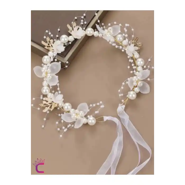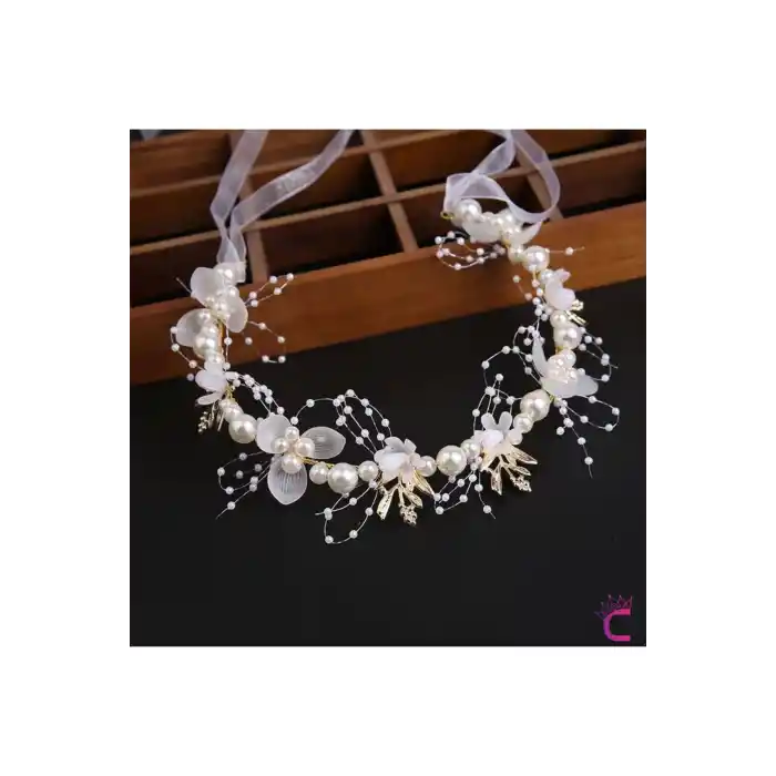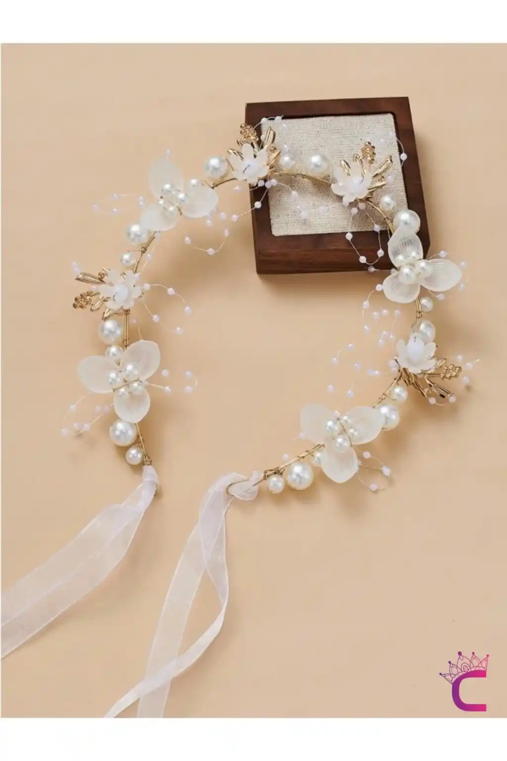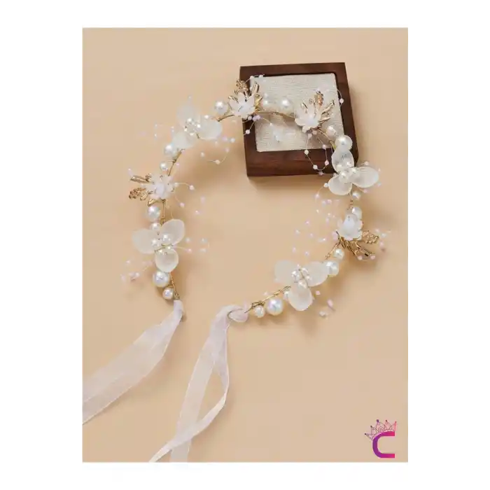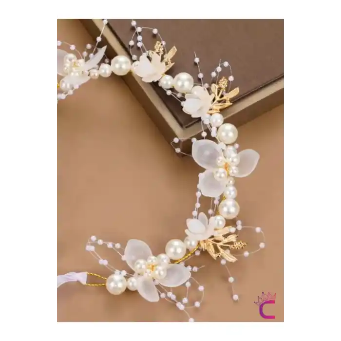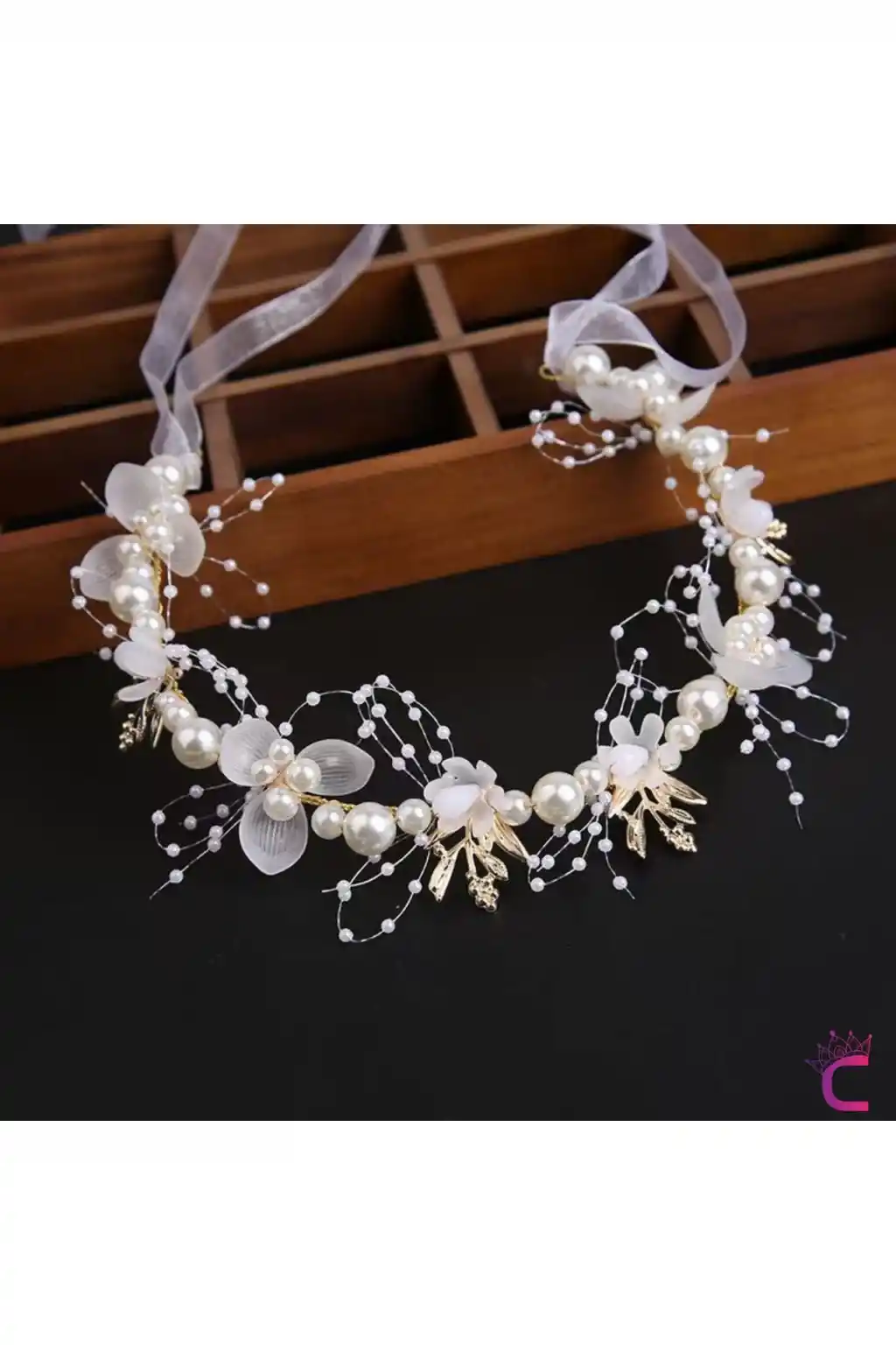 Zarif Beyaz Çiçekli İncili Gelin Tacı Gümüş - Helen Saç Bandı Topuz Tokası Düğün Nişan Aksesuarı